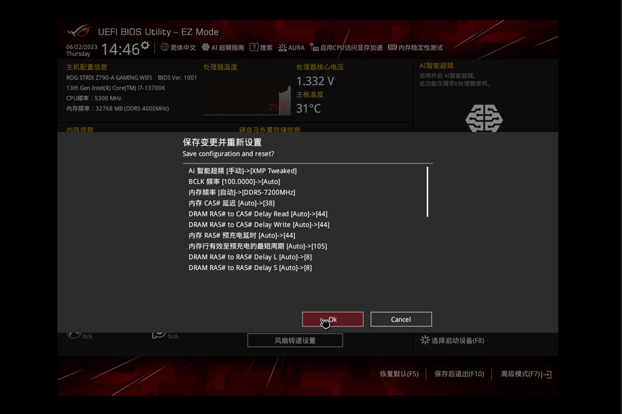 全部配置完成后,选择保存配置并重启电脑,至此超频完成。