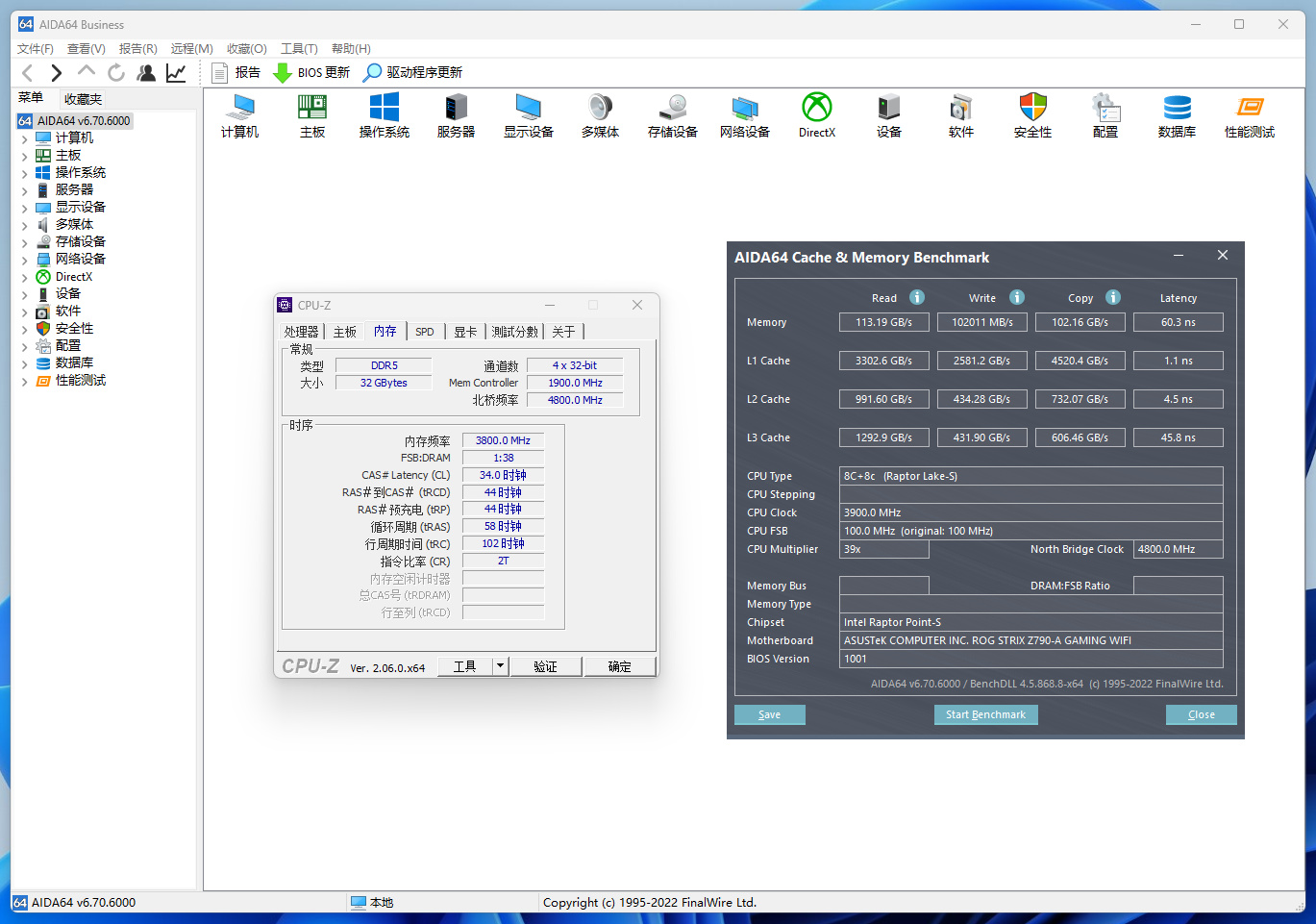 两条内存走手动超频,我这套硬件最高7600MHz+C34,测试结果如下图所示: