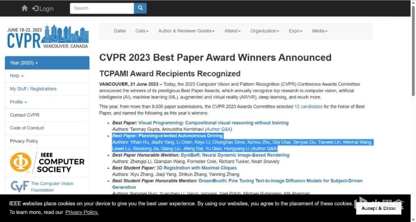 最終,僅有2篇論文,從9155篇的投稿中脫穎而出,獲得“最佳論文獎”!第一篇名爲Planning-oriented Autonomous Driving(以路徑規劃爲導向的自動駕駛),由上海人工智能實驗室、武漢大學及商湯科技聯合完成。