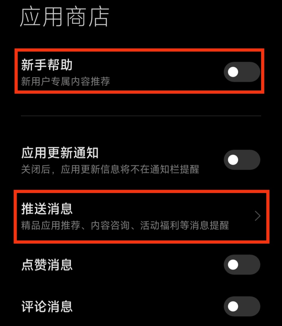 3.1打开“应用商店”,右上角设置–通知设置,将“新手帮助”关闭,点进“推送消息”,选为不允许通知