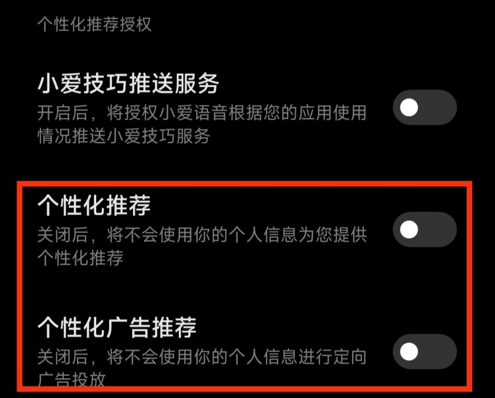 小爱同学–右上角个人–右上角设置–小爱语音–底部隐私管理–隐私设置,将加入用户体验计划关闭,底部个性化推荐和个性化广告推荐关闭