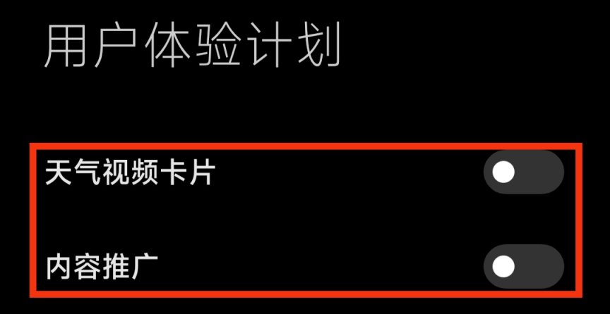 打开“天气”,右上三点–设置–用户体验计划,将“天气视频卡片”和“内容推广”关闭