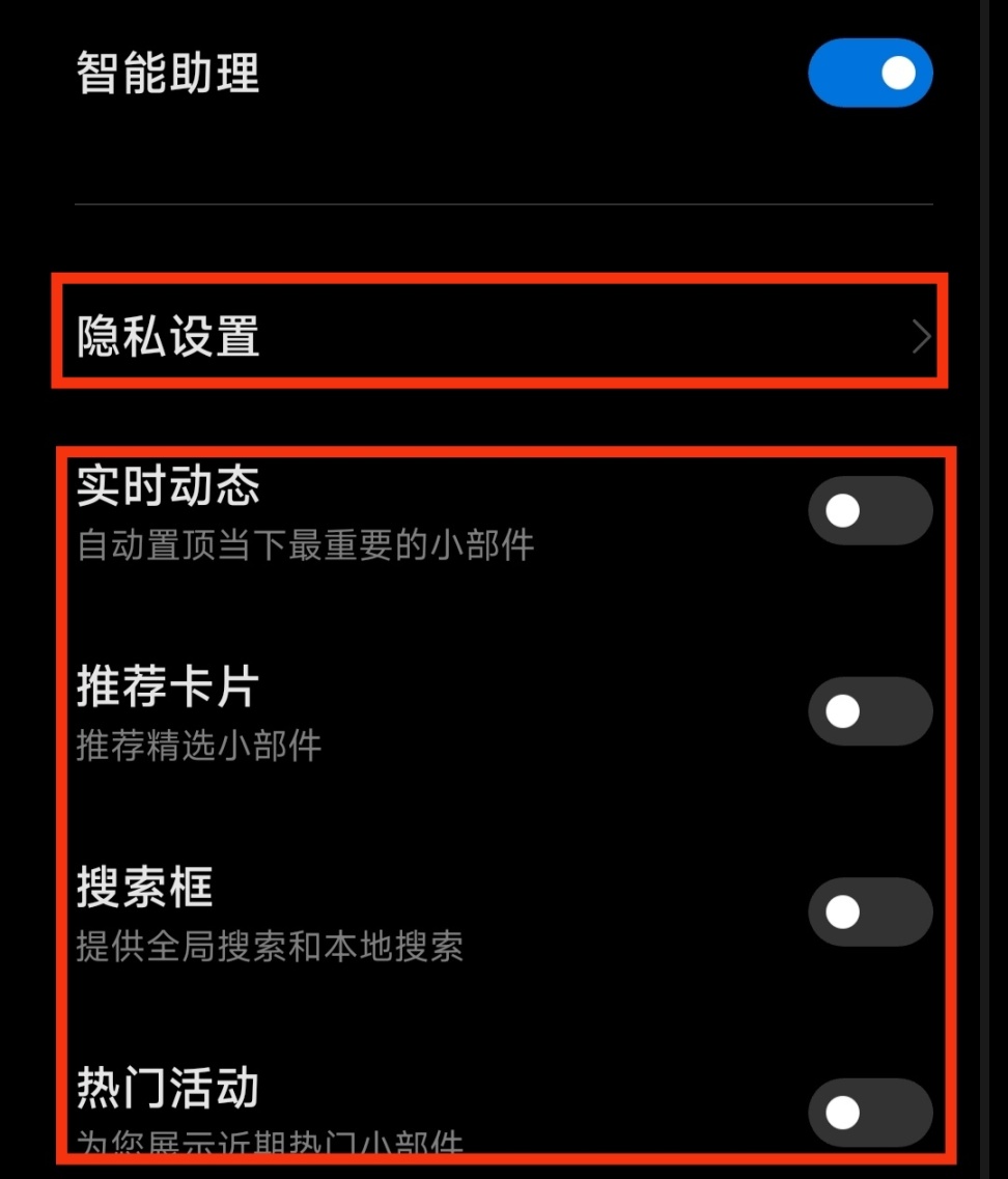 打开“设置”–桌面,在隐私设置中关闭个性化推荐,推荐下方四个选项全部关闭。也可以直接关闭智能助理,不要此板块