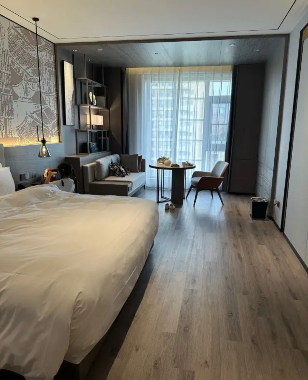 我头一次入住该酒店时,正值其刚开业而积攒口碑之时,房客稀少入住愉快,以很低价格预定的豪华大床房也贴心的被升级为了行政大床,由于询问了我的个人偏好,我被安排在11层一个角落房间,入住时赠送了果盘和伴手礼,也是值得表扬的一点。进门正对的地方是浴室,左转才是客房,行政楼层的床边是铺设地毯的(普通房型则是完全木地板),在浴室以及入户玄关是瓷砖铺设,倒也很合常理。然而即使是行政房,浴室也是没有配置浴缸的,询问前台得知,只有行政亲子套才会配备浴缸。再加上酒店不配有泳池和健身房,按照普遍的酒店分级的硬性标准,这点就让西安云和夜泊酒店与“豪华五星”无缘了,但显然,云和夜泊的软件服务水平,都是对标着豪华五星级去的,不过扪心自问,又有多少大陆游客会在一天的游玩之余考虑游泳健身?又有多少大陆房客会在住酒店时泡浴缸?确实好像不多,省下来的这些钱,用去提升服务质量倒也无可厚非。怎么说呢……“云和夜泊,更适合中国宝宝体质的‘五星’酒店?”