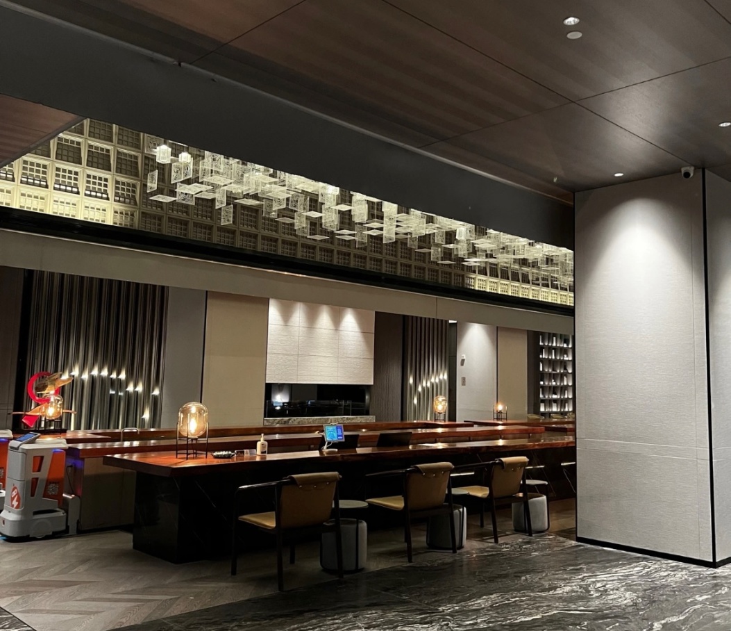 在通过屏风式设计的入口,类似空间站气闸舱设计的两扇巨大自动移门之后,左转就能是酒店的一楼大堂,入住登记处比起普通酒店大堂的柜台式设计,采用了一种较为少见的“回字”型长桌设计,即,酒店迎宾登记处的工作人员在 “回”的中间那个空间,而房客则在回字外围办理登记入住。