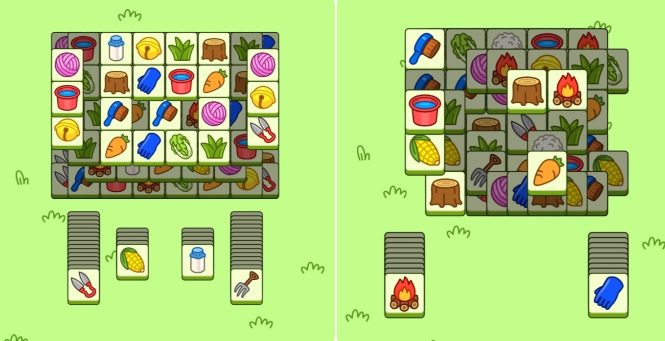 更为重要的是,尽管第二关图标数量急剧增加,但刚开始时玩家拥有大量可点击的上层图标,玩家拥有广阔的决策和试错空间。而关卡整体图标从上到下的覆盖是呈“倒金字塔”结构的,这意味着随着第二关的进行,玩家可选择的图标会越来越少,到后来甚至会少于图标类型的数量,后期这样低容错、高随机的设计为何不会不让玩家卡住呢?