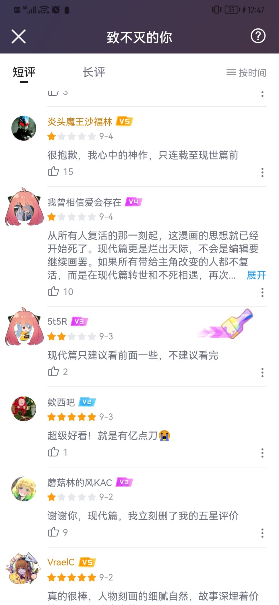 当然,以上的好评只到前世篇为止,当进入现代篇后,剧情开始迷惑起来(个人意见,目前评价不一,笔者读到155话弃了如果结局惊喜还会捡起来)人设略崩,剧情不再围绕不死的成长,而且因为作者身体原因,很多话都被拆成小段更新,看起来是周更但实际上内容少,给人以被编辑要求不能完结所以一直画的感觉