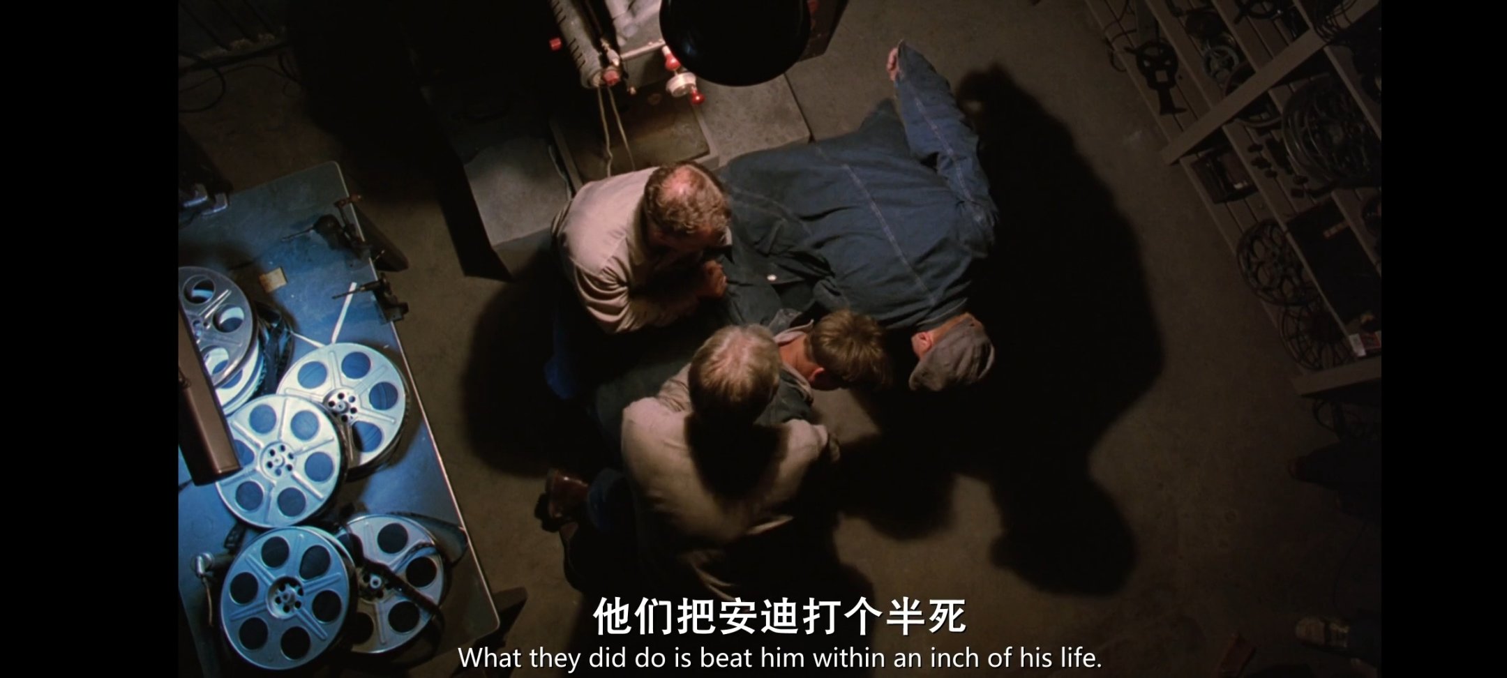 安迪入狱的那天,瑞德跟他的朋友们打赌,用十根香烟赌安迪第一个哭,可惜他赌输了,安迪一整晚都没有流过一滴眼泪,可是在那天晚上,有个人因为痛哭吵到了狱警队长海利,被他生生殴打凌虐致死。
