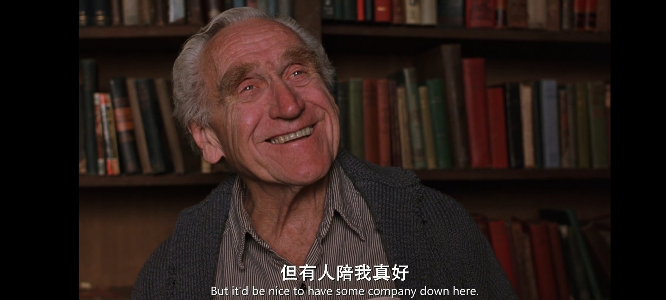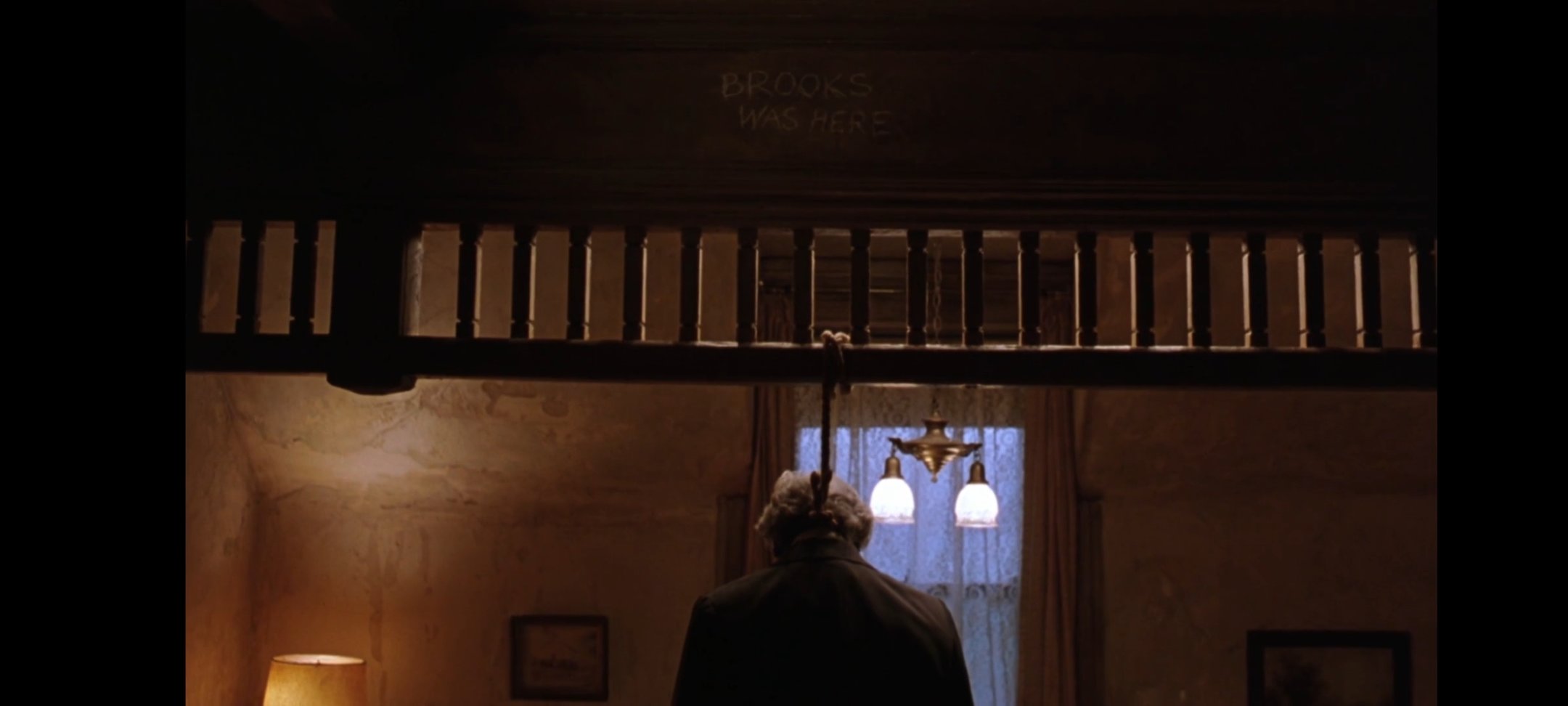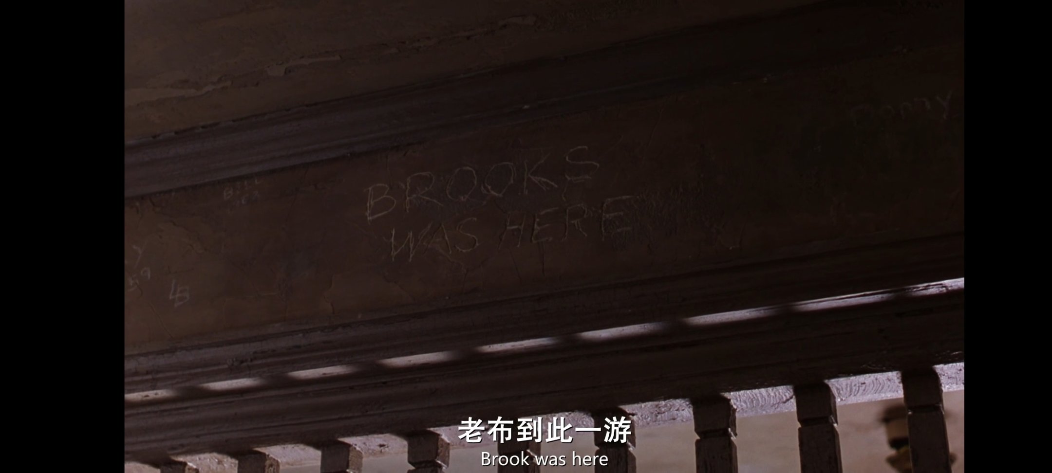 离开监狱的老布被监狱安排在一家超市当捡货员,他太老了,他的手还止不住的发抖,超市的店长对待他也没有一句好话,他孤独万分,乌鸦也被他亲手放飞,他什么都不剩了,最终在监狱分配给他的房间里,他在房梁上刻下[老布到此一游],穿上干净而整洁的西装,给监狱里的安迪和瑞德他们寄了一封告别信,随后用房梁上的绳子结束了自己的生命。