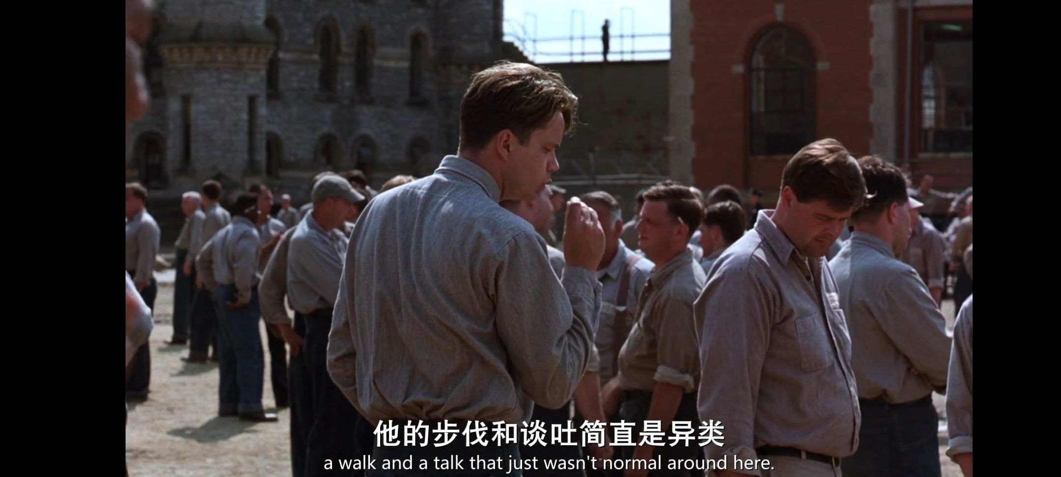 而这就是安迪吸引人的所在,在全员逐渐体制化的过程中,安迪是那么的另类和超凡脱俗,在高墙内16年的牢狱生活,蒙受冤罪,被强奸、被监禁、被迫洗钱,纵使一切来自于社会的阴暗面向他袭来,他仍旧保持自我,没有被历史车轮辗轧,他不是一个众人皆醉我独醒的存在,但他是一个明晰自我,知晓自己要做什么,应该做什么的人。