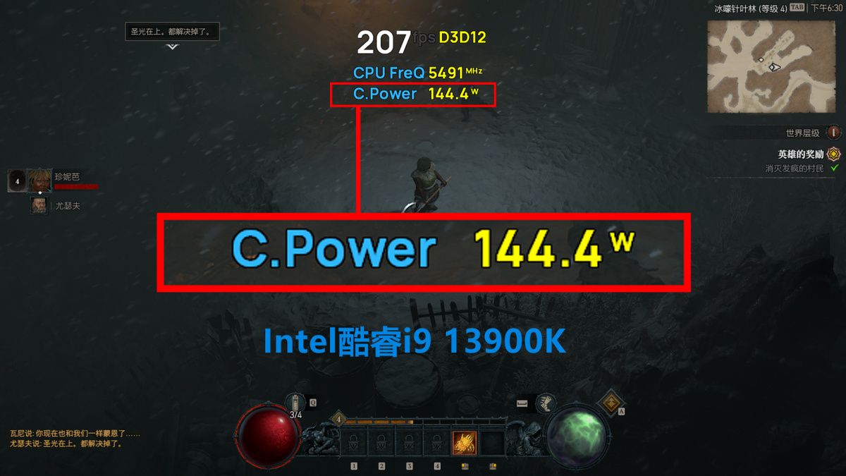 ▲酷睿i9 13900K在《暗黑4》中的功率長期在110W以上,經常飆升到145W左右