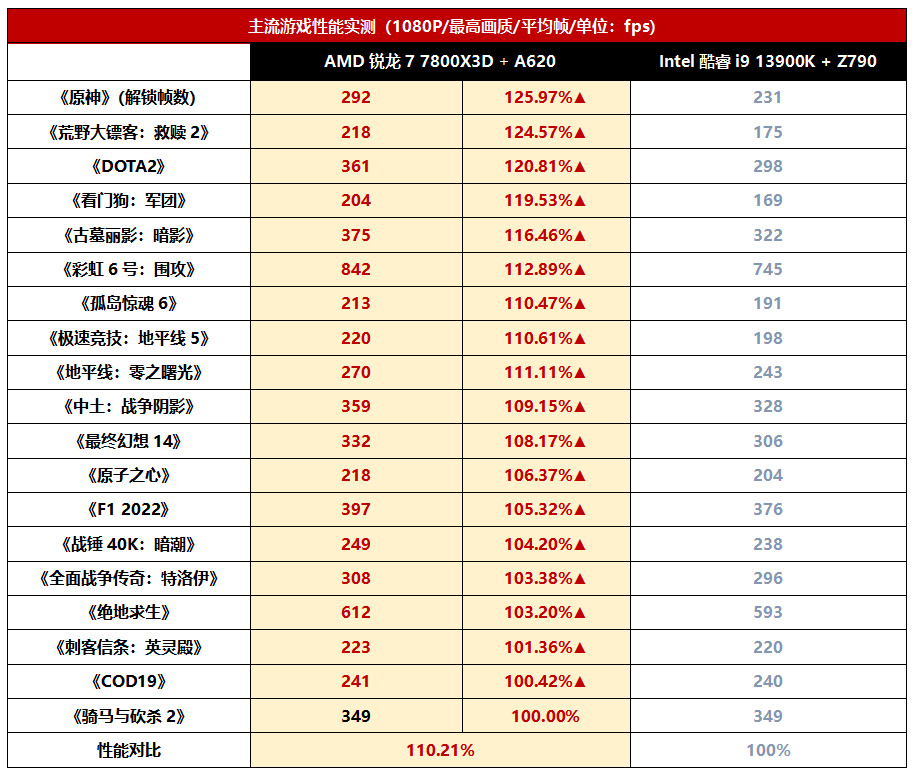 在主流的遊戲當中,銳龍7 7800X3D的性能表現都超越了酷睿i9 13900K,其中優勢最高的甚至接近26%,平均下來也超過了10%,這足以表明銳龍7 7800X3D在遊戲體驗方面是高於酷睿i9 13900K的。更重要的是,得益於先進的工藝,主流大作中銳龍7 7800X3D最高功率還不到75W,而酷睿i9 13900K大多數遊戲中都超過了100W,最高甚至接近140W,其能能耗比表現大幅領先。
