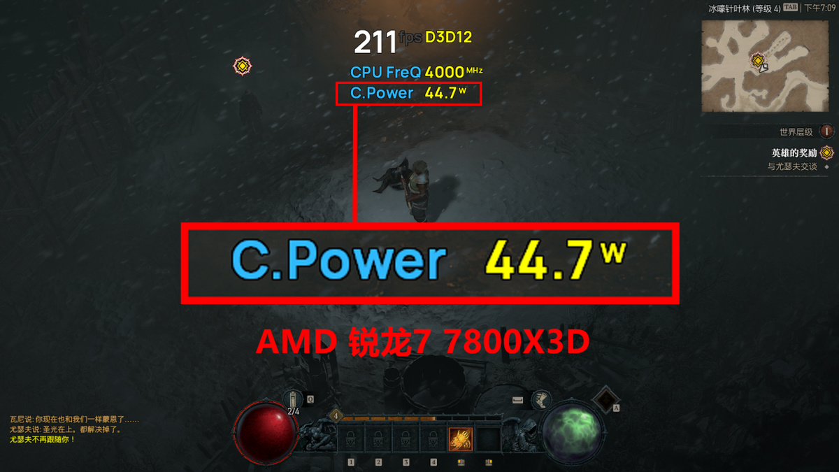 ▲銳龍7 7800X3D在《暗黑4》中的功率甚至不到50W