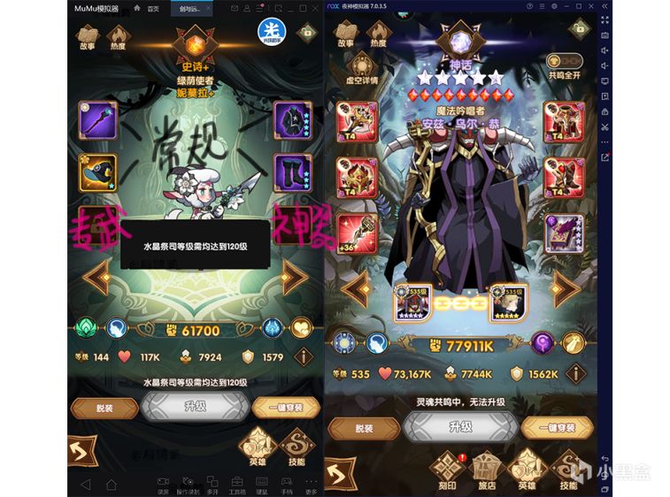 每个英雄6个装备槽位,分别是4个常规装备槽、1个英雄专属装备槽、1个神器槽。常规槽位的强化只需要吃经验币和装备,由于养成(白嫖)难度比较简单,只有少部分人为此付费。