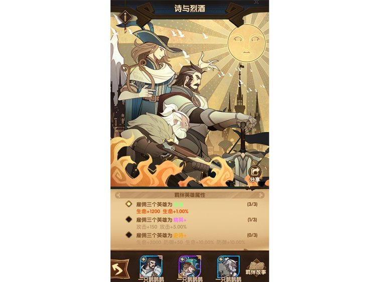 与生命树具有相同设计目标的是英雄羁绊系统,但该系统则简单许多并且更容易达成。每个羁绊指定2-3个英雄,只需将指定英雄均进阶至普通(绿)、精英+(紫+)、史诗+(橙+)品质就能解锁3条属性固定加成效果,当然,加成只针对指定英雄。