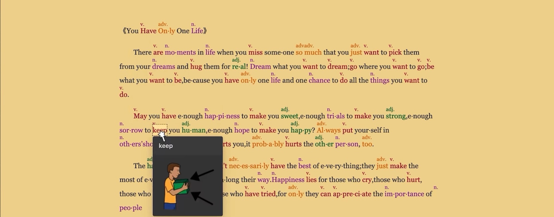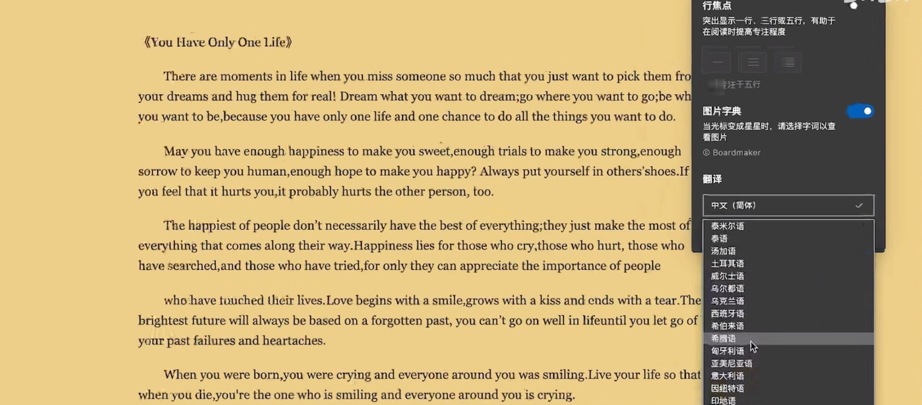 如果閱讀的是英語文本,點擊右上角的語法工具,可以用不同的顏色標記不同的詞性(動詞,名詞等)