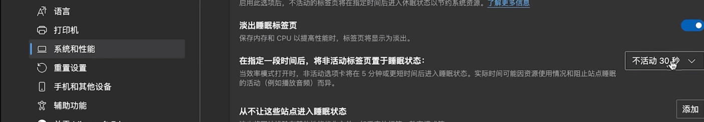 當打開多個頁面時,可能很多人會遇到加載緩慢的問題,只需要點擊右上角的三個點,再點擊系統與性能,設置非活動時的休眠時間。當在設置的時間內該標籤頁都沒被打開時,edge瀏覽器就會結束該網頁進程,減少計算機的資源佔用,釋放內存以減少網頁加載時間