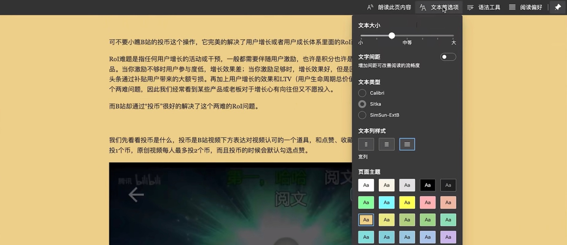 全選內容點擊右鍵可開啓沉浸式閱讀模式,隨後將進入一個非常乾淨整潔的閱讀界面,點擊右上角文本選項,可以設置字體大小和背景顏色等功能。