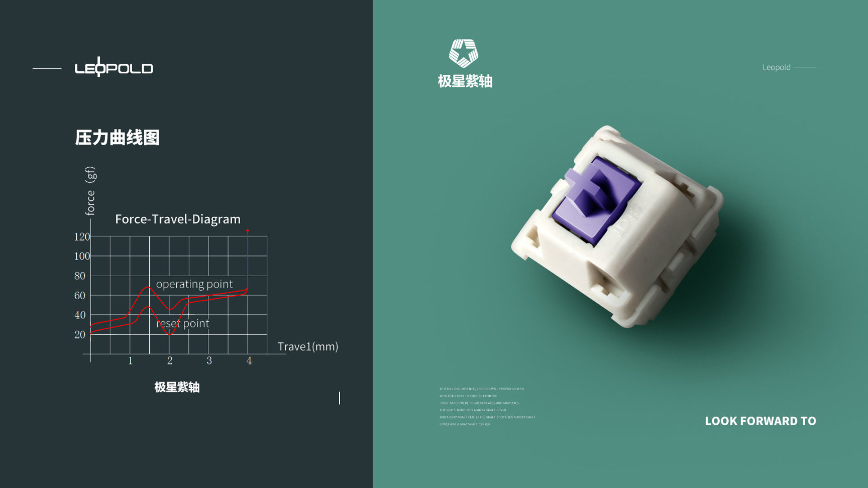 大段落轴体或者叫提前大段落轴体,与前两种轴体不同,大段落轴体的段落感是轴体触发时就有的,有点感觉像过山车,按的时候压力大,按下去压力一下子减小触底,可以说非常类似打字机或者薄膜键盘的胶碗触发,是目前比较流行的独特手感轴体。每一款大段落的设计调校都有所不同,因此其手感差别还是有不少的,个人建议大段落轴体自己多多体验才能知道自己的喜好,