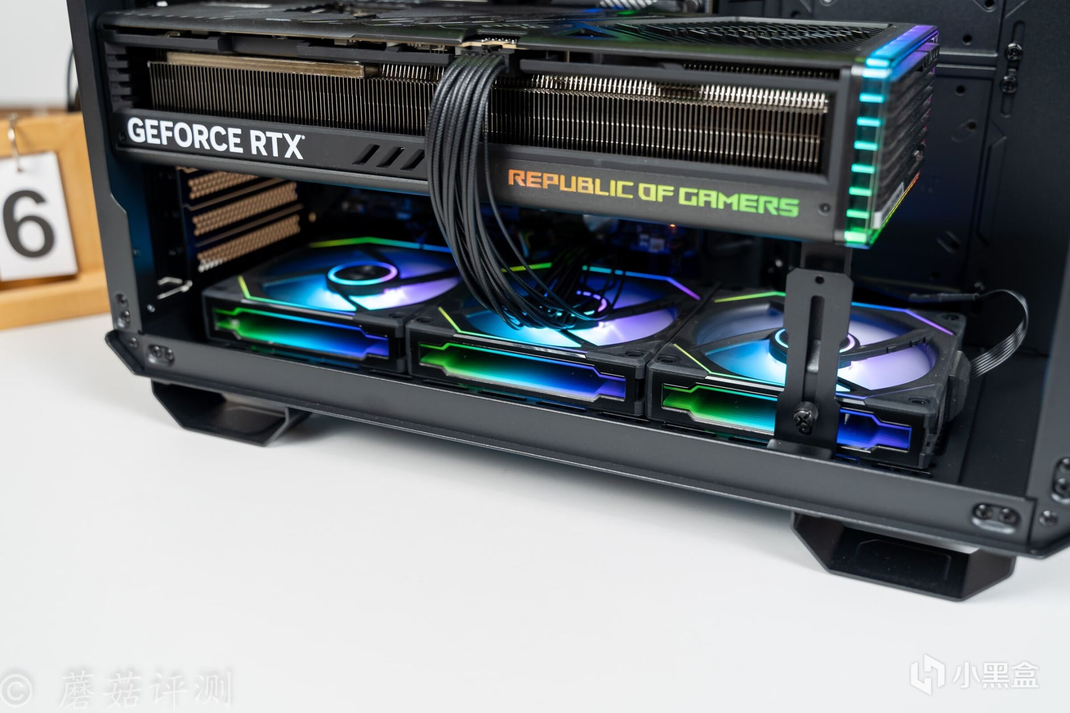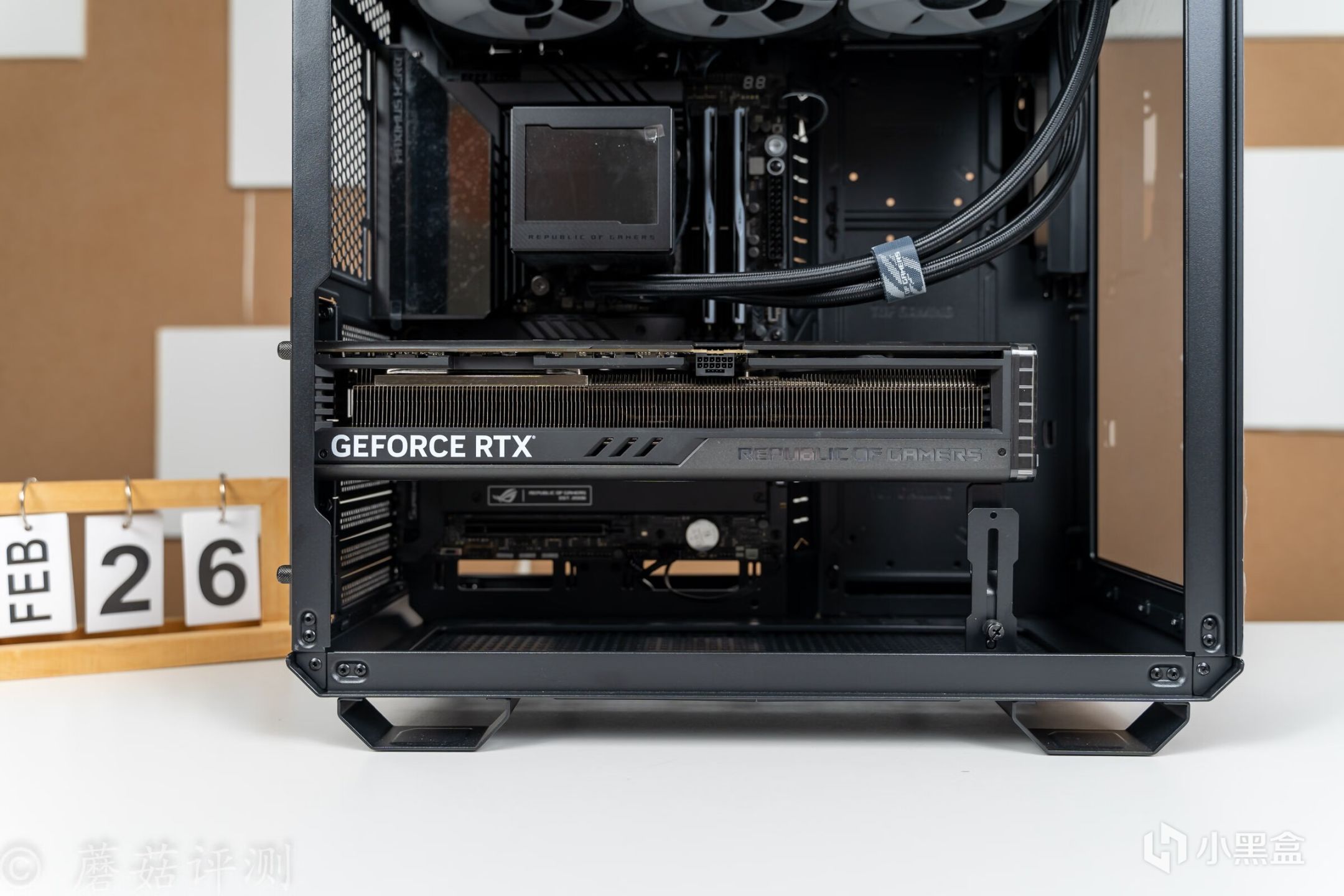 ▼顯卡採用水平安裝,並在顯卡的尾部撐一個顯卡支架。這個顯卡支架是機箱標配的,磁吸式固定,還挺牢固的。