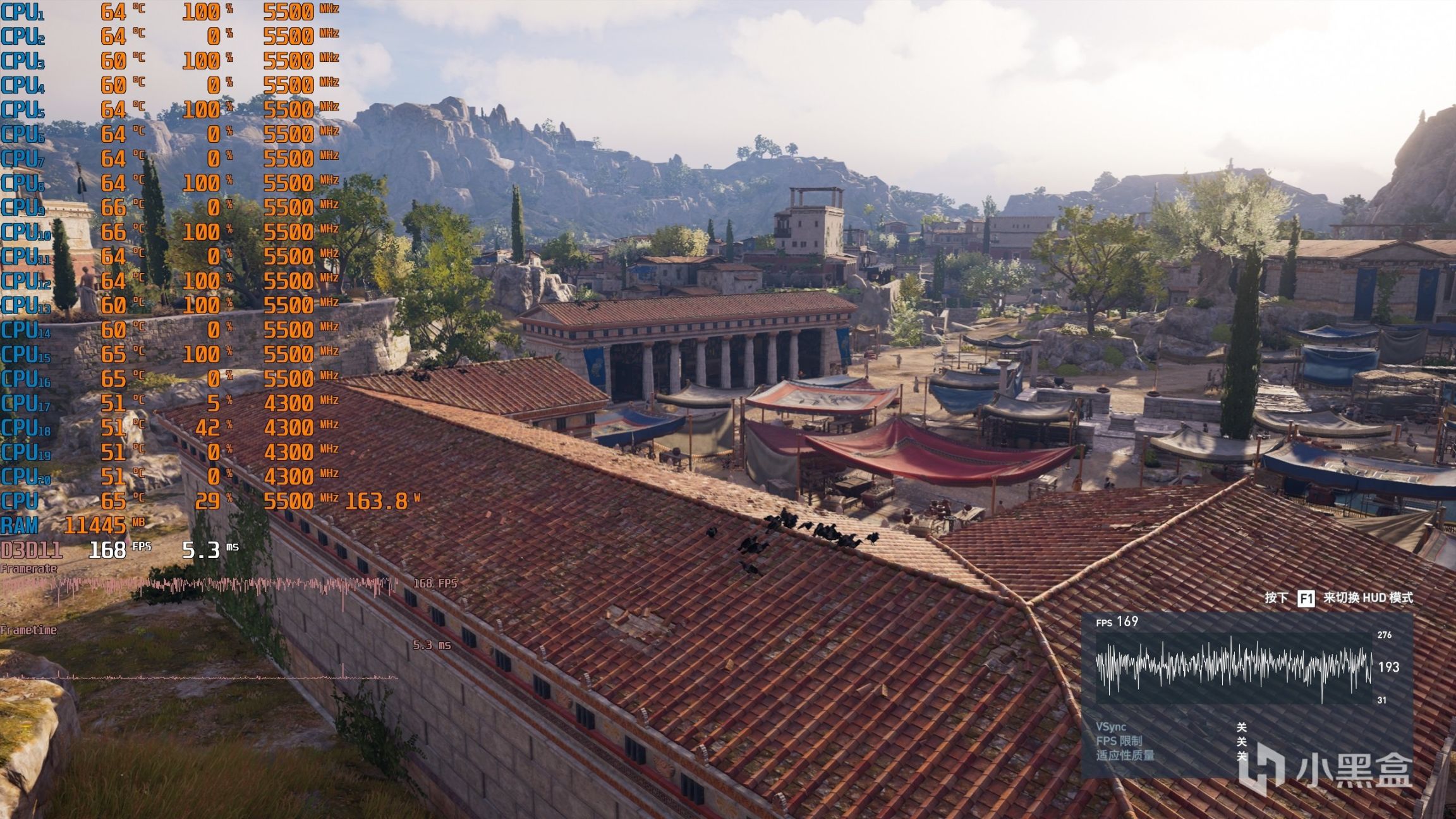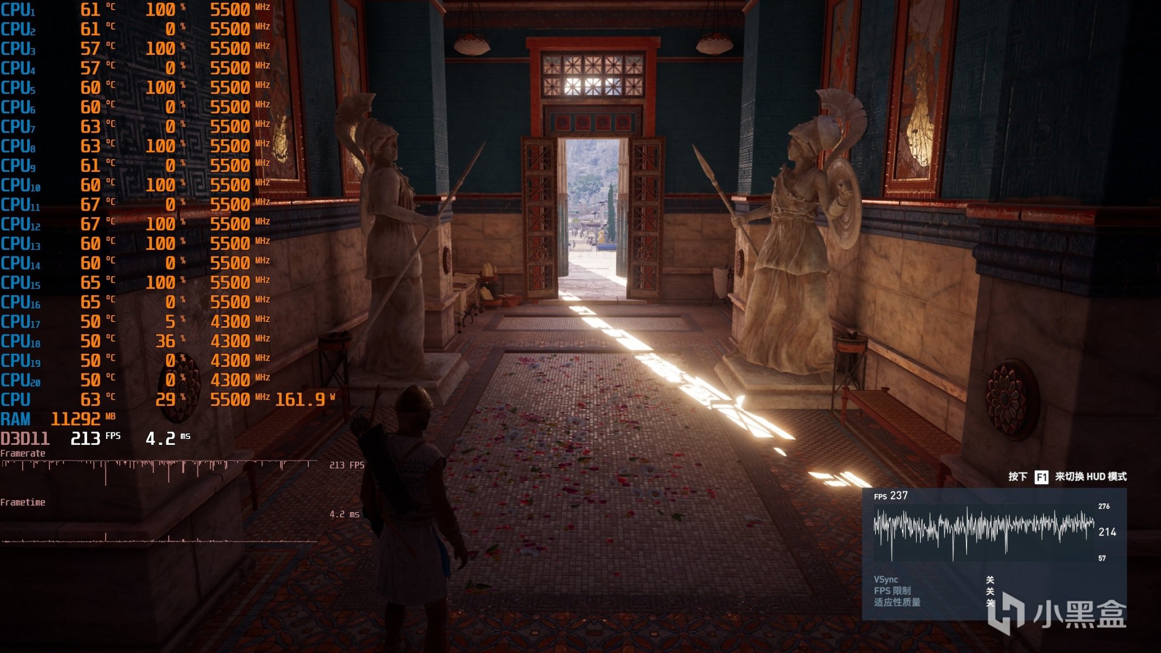 ▼簡單跑個遊戲測試,衆生平等奧德賽,2K分辨率,極高畫質,走廊遊戲幀數在213幀左右,非常流暢。