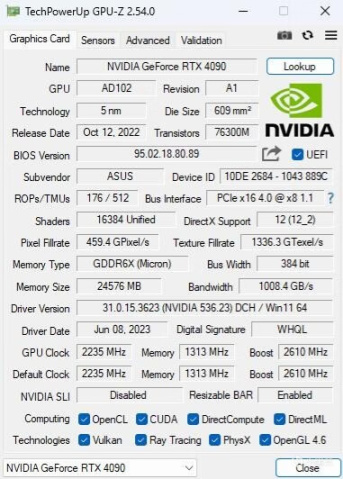 ▼RTX4090的性能表現非常給力,核心是AD102,流處理器16384個,顯存24GB,鎂光的GDDR6X顆粒。