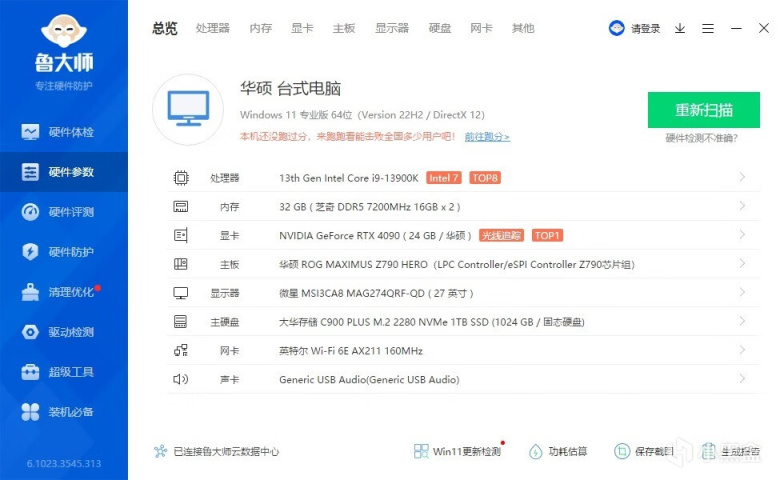 ▼整機配置一覽,處理器是13900K,主板是ROG的Z790 Hero,顯卡是ROG的RTX4090猛禽。