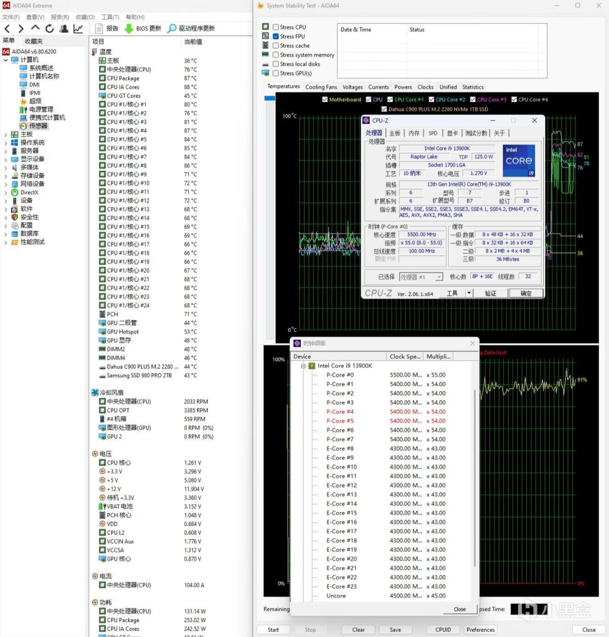▼簡單跑個CPU-Z的壓力測試,處理器功耗去到260W左右,溫度在76℃左右,大核心睿頻5.4GHz,小核心睿頻4.3GHz。