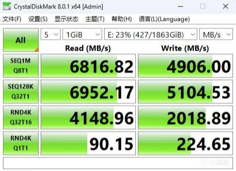 ▼簡單跑個測試,順序讀取速度6816MB/s、寫入4906MB/s,4K讀取90MB/s、寫入224MB/s。