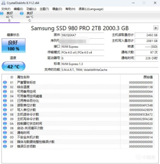 ▼三星的980Pro,2TB容量,接口輕鬆穩定在PCIe 4.0 x 4。