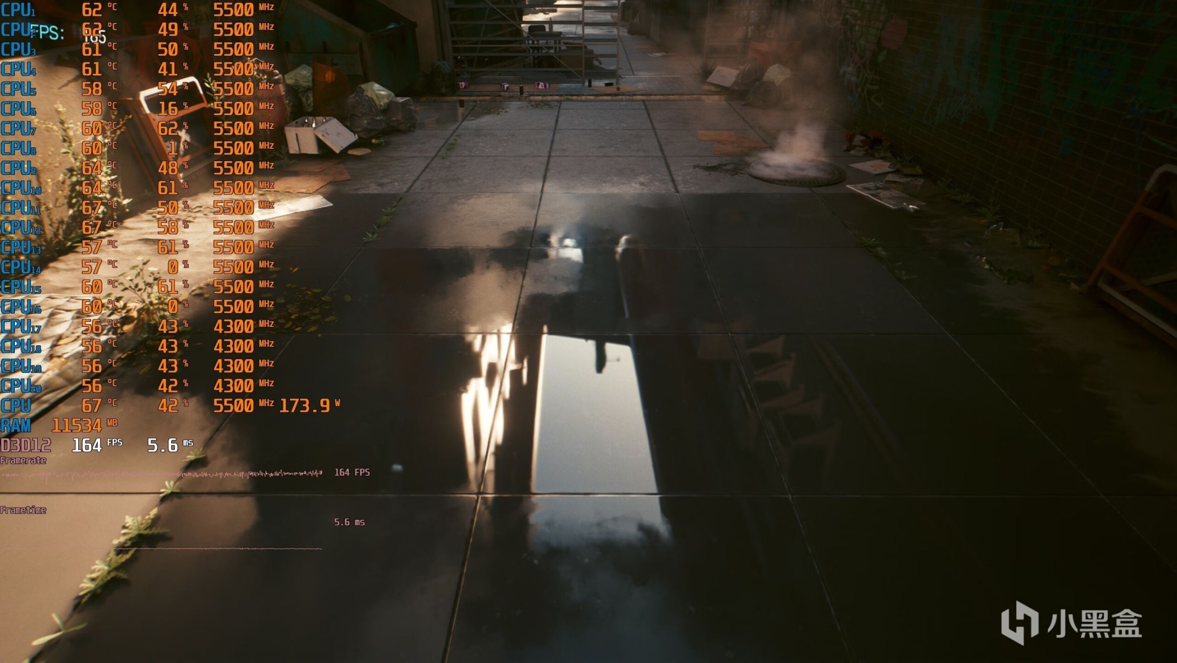 ▼室外水灘的遊戲幀數在164幀左右,非常流暢。在光追超級特效下,水灘內的光影效果非常真實,倒影畫面很精細。