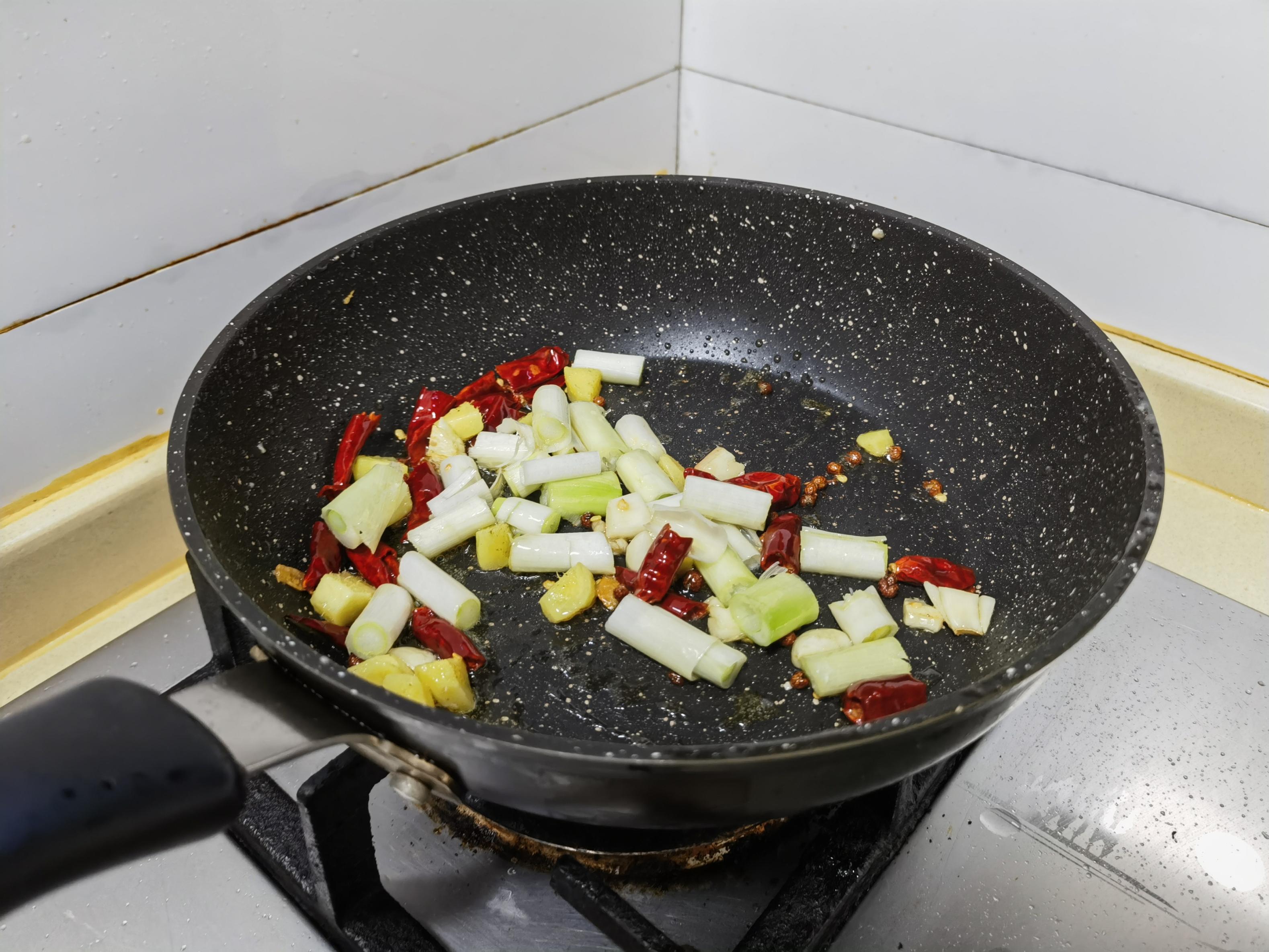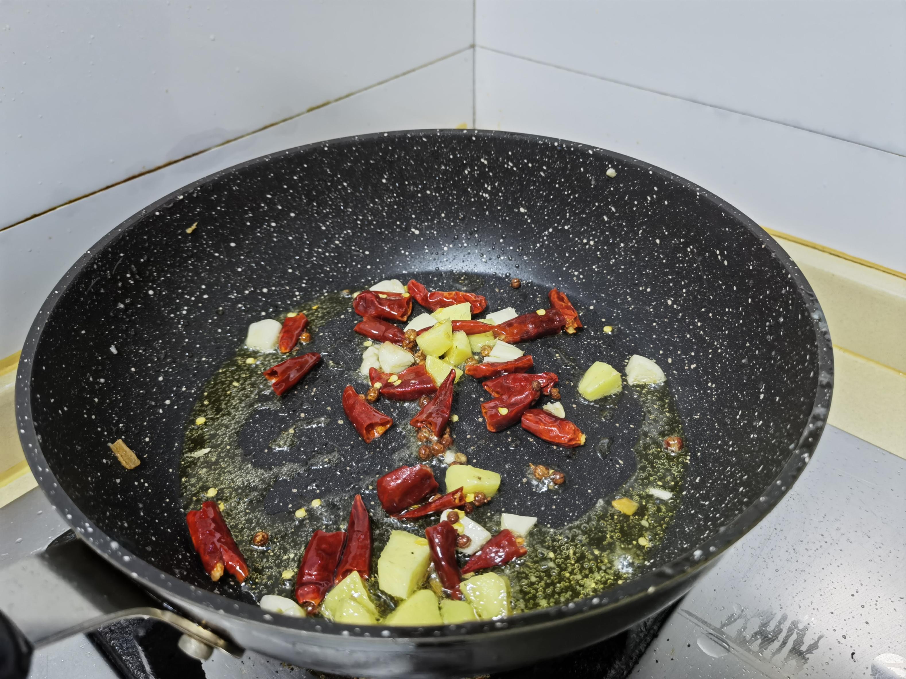 翻炒出香味后即下入提前沥干水分的干辣椒和花椒,