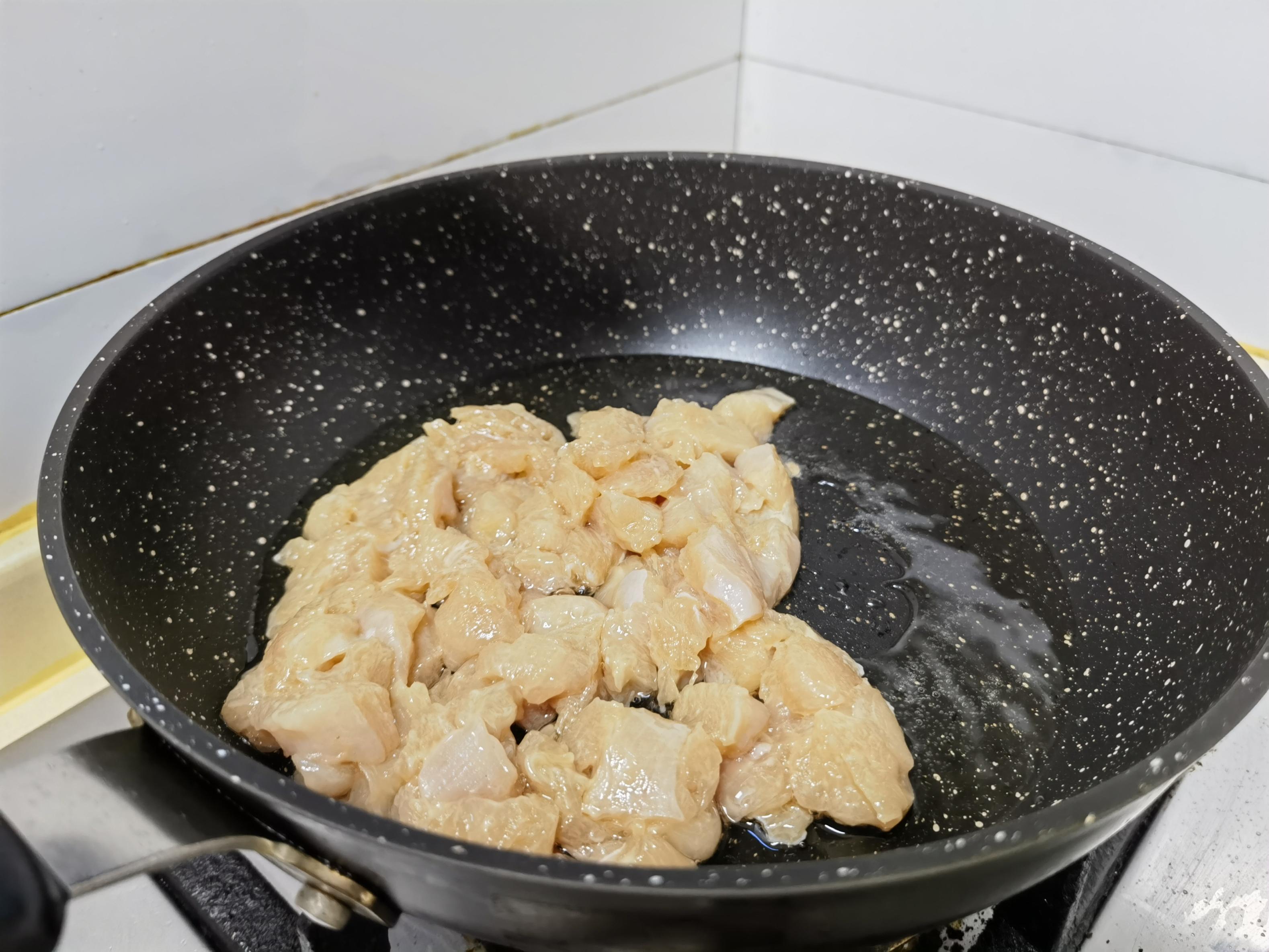锅内烧油,油五成热时下入鸡丁滑炒,