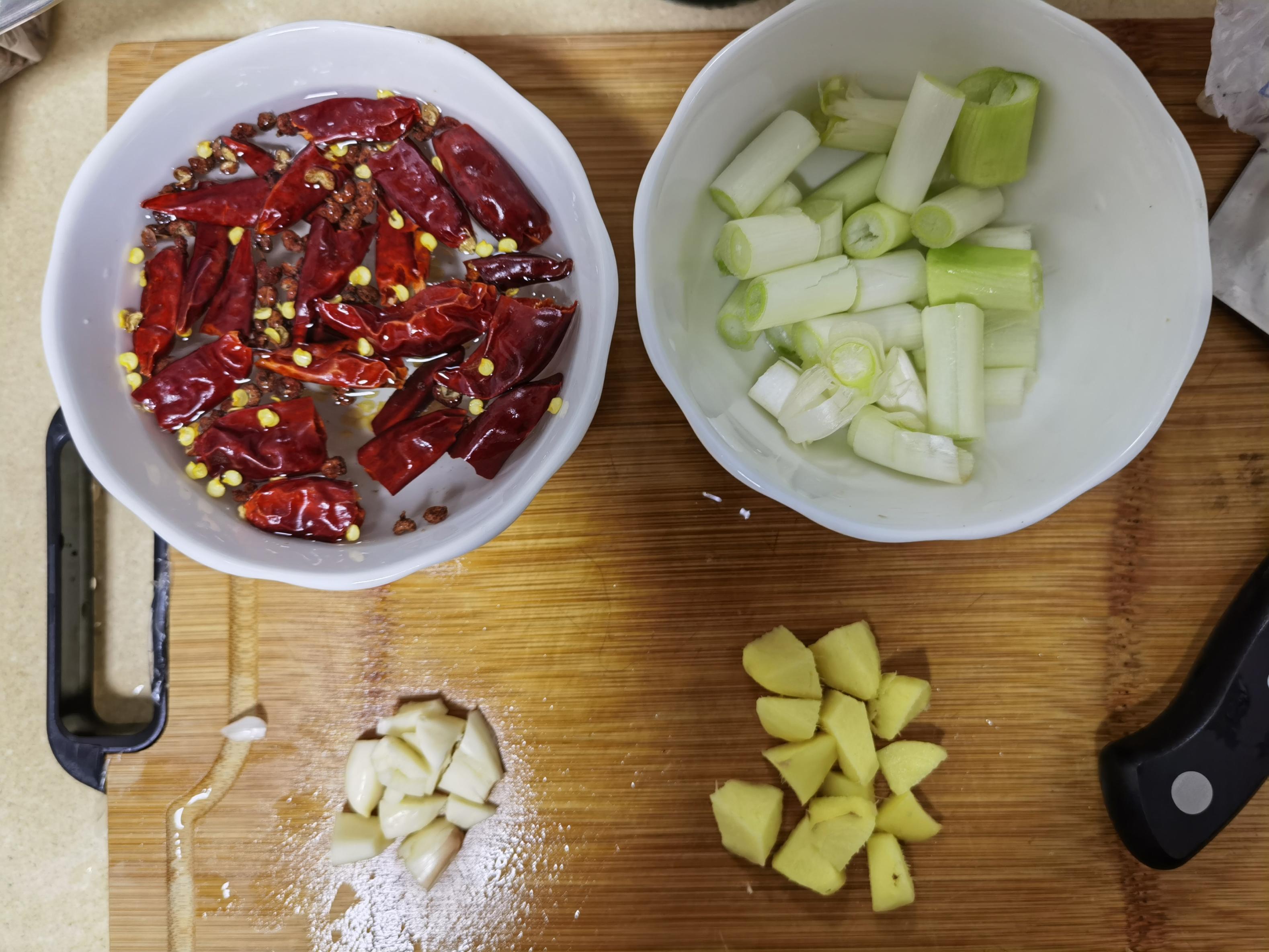 姜、蒜切成小丁,大葱切段,干辣椒和花椒泡水;