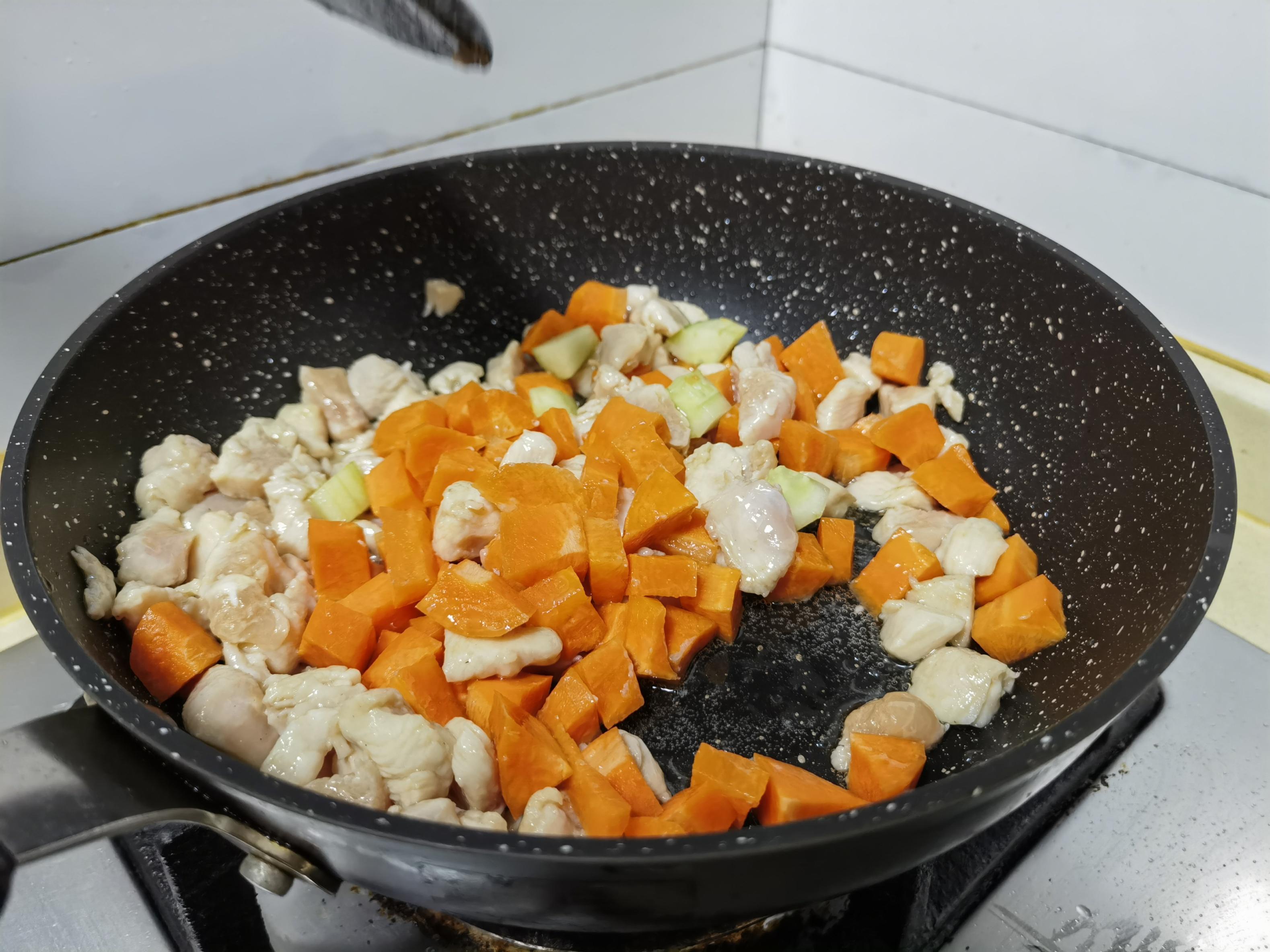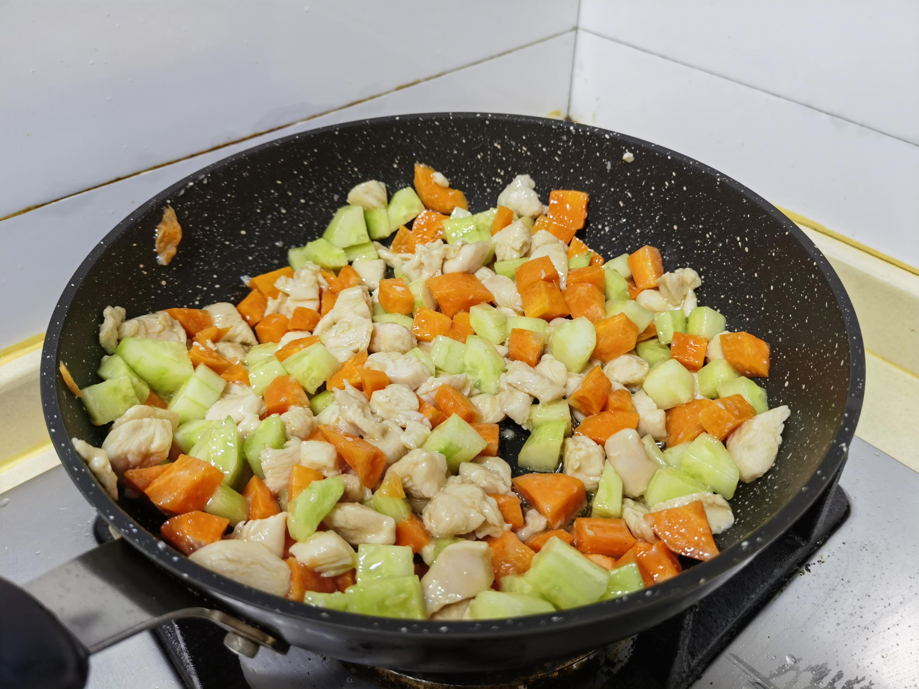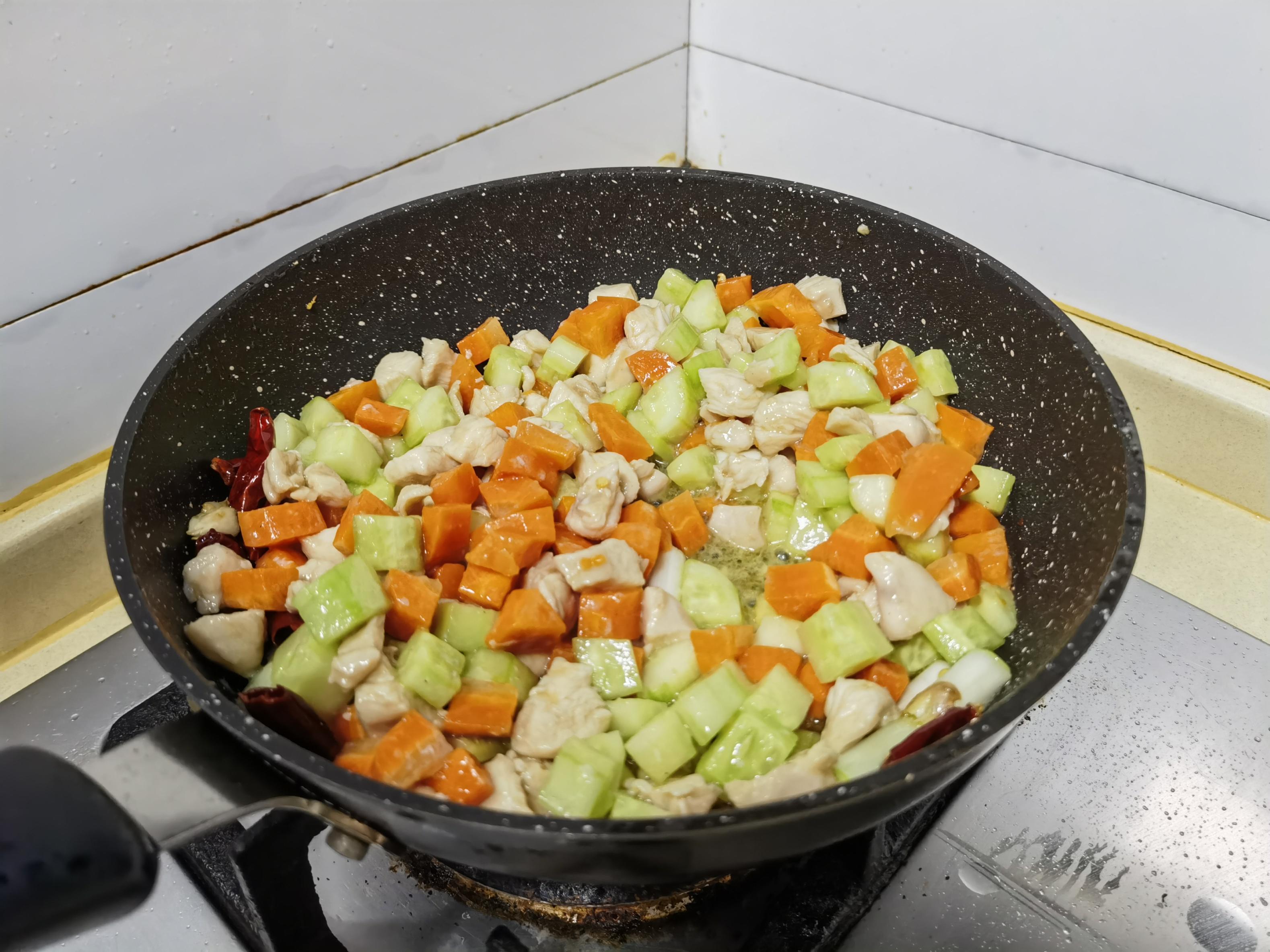 中火炒至鸡丁血色刚消失时即下入胡萝卜丁,