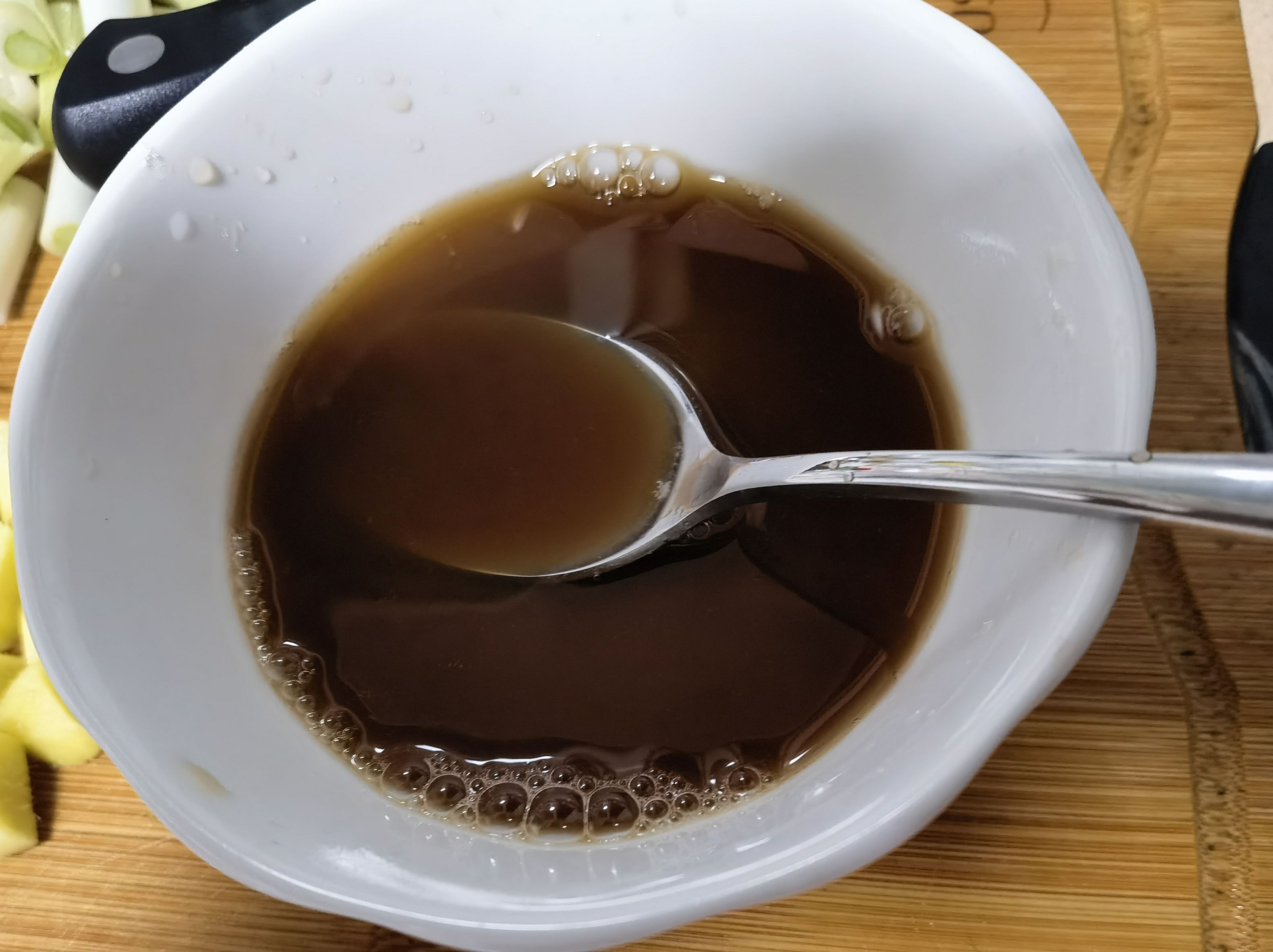 先调碗汁:加入半勺盐、三勺糖、小半勺味精、一勺料酒、三勺生抽、三勺陈醋、一勺玉米淀粉,再加入三勺清水,拌匀;