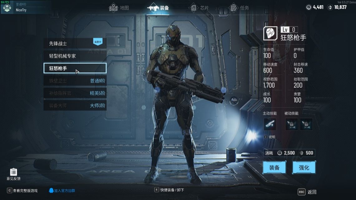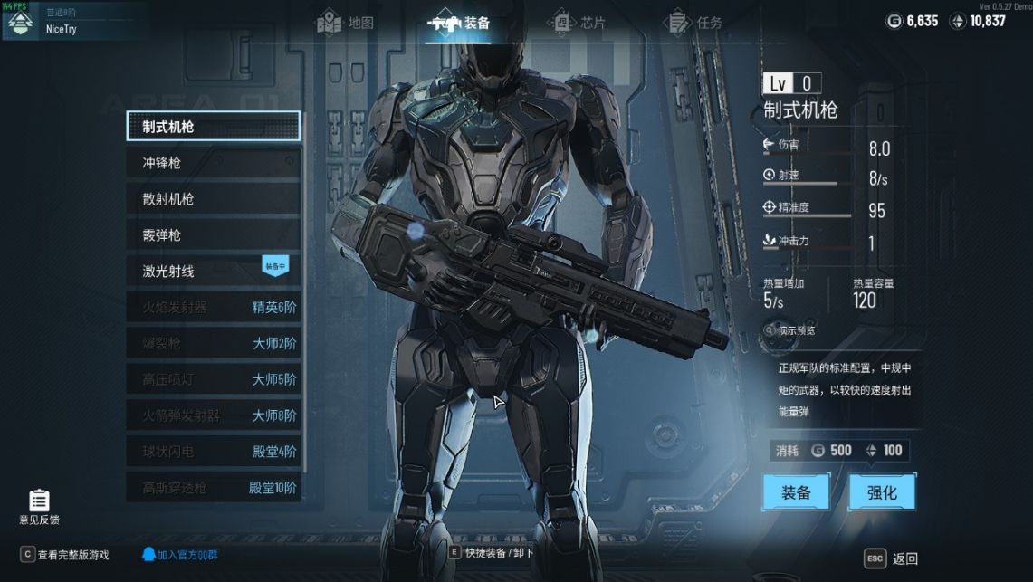 從DEMO中公佈的信息來看僅有人物角色(機甲)和武器,武器僅僅解鎖了制式機槍、衝鋒槍、散射機槍、霰彈槍、激光射線。