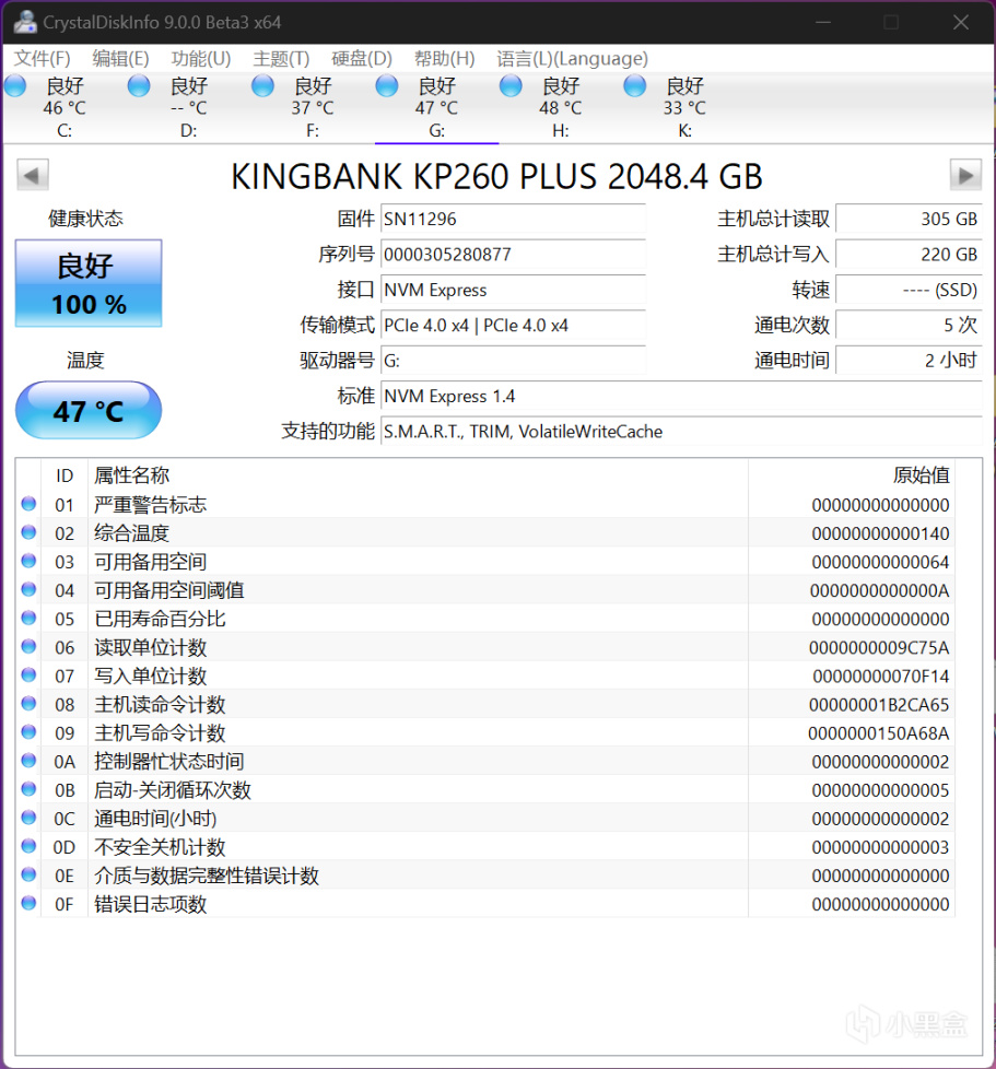 最後來測試一下KP260 PLUS這款SSD,KP260 PLUS 2TB支持NVME 1.4協議、S.M.A.R.T、TRIM和Volatile Write Cache功能,安裝在B760 PRO RS第一組帶散熱片的M.2插槽,固件版本爲SN11296,待機溫度爲47℃。