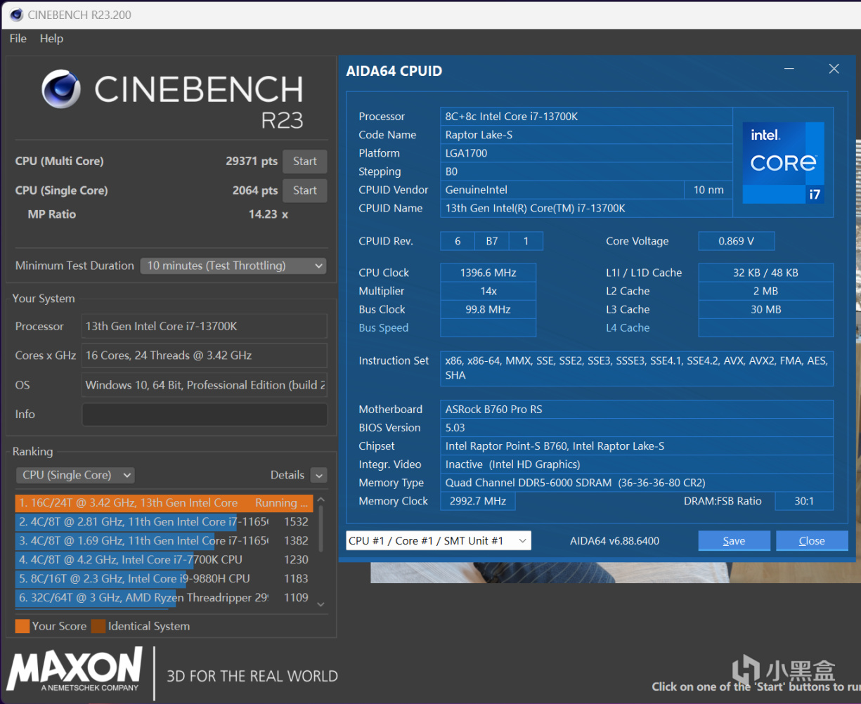 搭配B760 PRO RS,CINBENCH R23十分鐘循環多核分數爲29371 pts,單核則是2064 pts