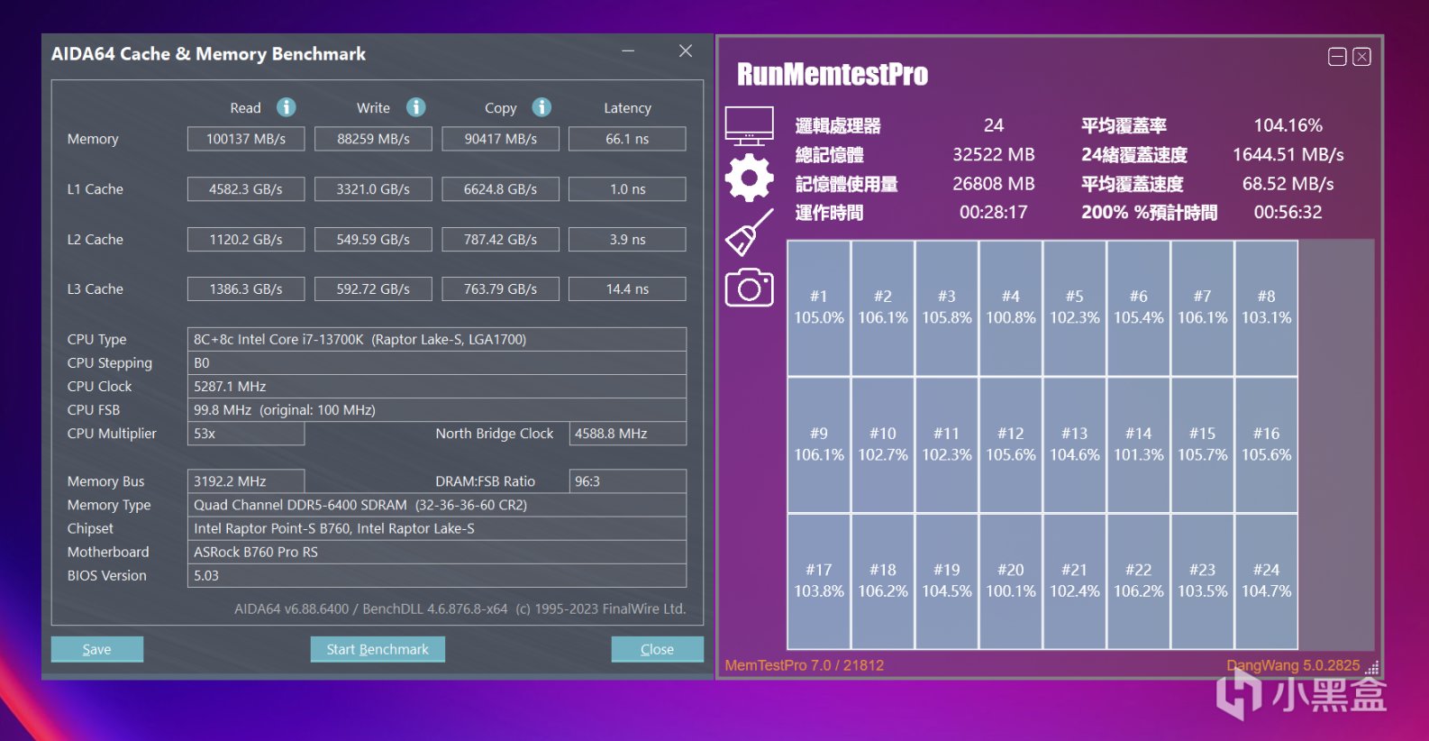 最終在這款B760 PRO RS主板上,黑刃DDR5 6000最多可以超頻至DDR5 6400(C32-36-36-60)穩定過RunMemtPro & 100%進度烤機,也可以DDR5 6600C36跑簡單負載但是烤機報錯。