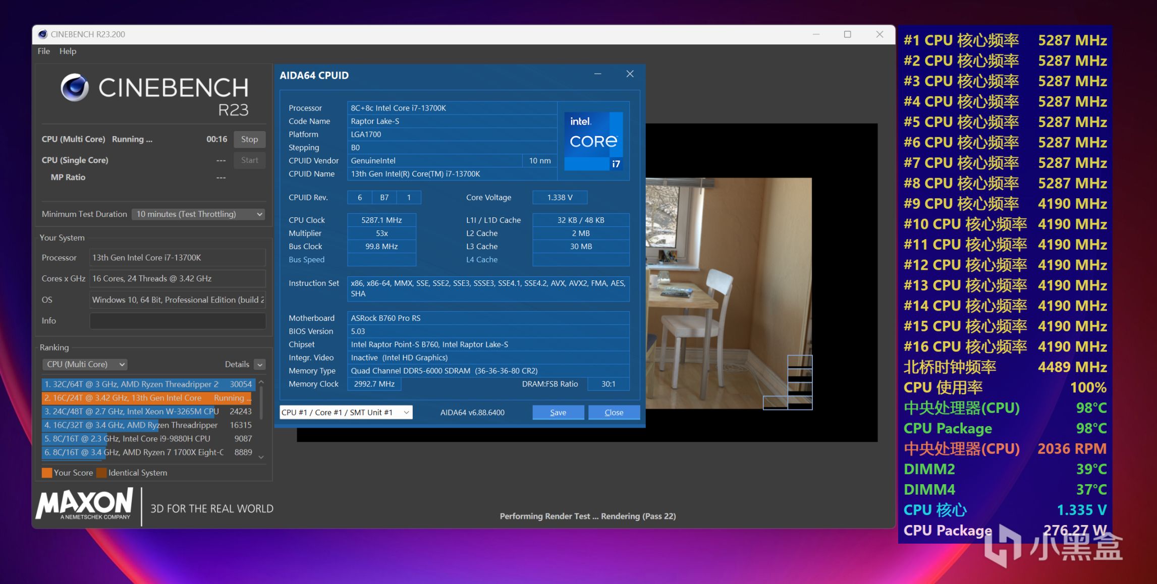 首先簡單粗暴使用CINBENCH R23多核循環項目烤機十分鐘,注意這裏主板是受CEP影響的,核心電壓給到1.33V,CPU Package功耗達到276W,快結束時i7-13700K依然可以保持大核5.3GHz+小核4.2GHz的穩定表現,全程沒有掉頻率,足以說明B760 PRO RS供電設計用料過硬,不過要實現這樣的效果,一款強勁的360水冷是必須的,空調房環境也少不了,不然就撞100℃溫度牆了。