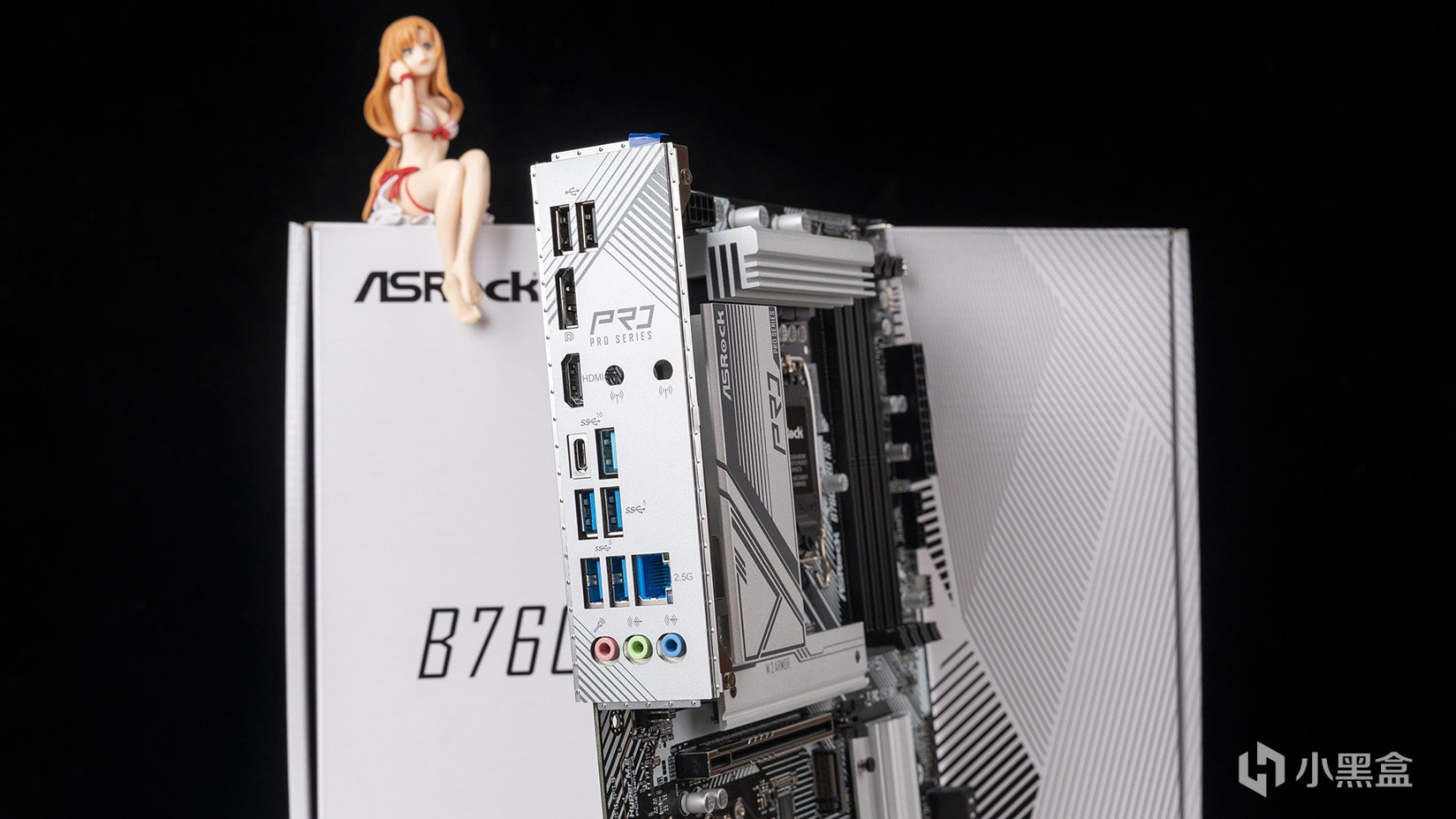 背板I/O部分,集成一體式擋板,佈局了2*USB 2.0(黑色)、4*USB 3.2 GEN 1(深藍)、1*USB 3.2 GEN 2(青藍)、1*USB 3.2 Gen2 Type-C、DisplayPort 1.4、HDMI、 Dragon RTL8125BG 2.5G網卡以及3*音頻接口,留有天線安裝端口位,接口數量和類型完全對標熱門的B760 MATX板型。