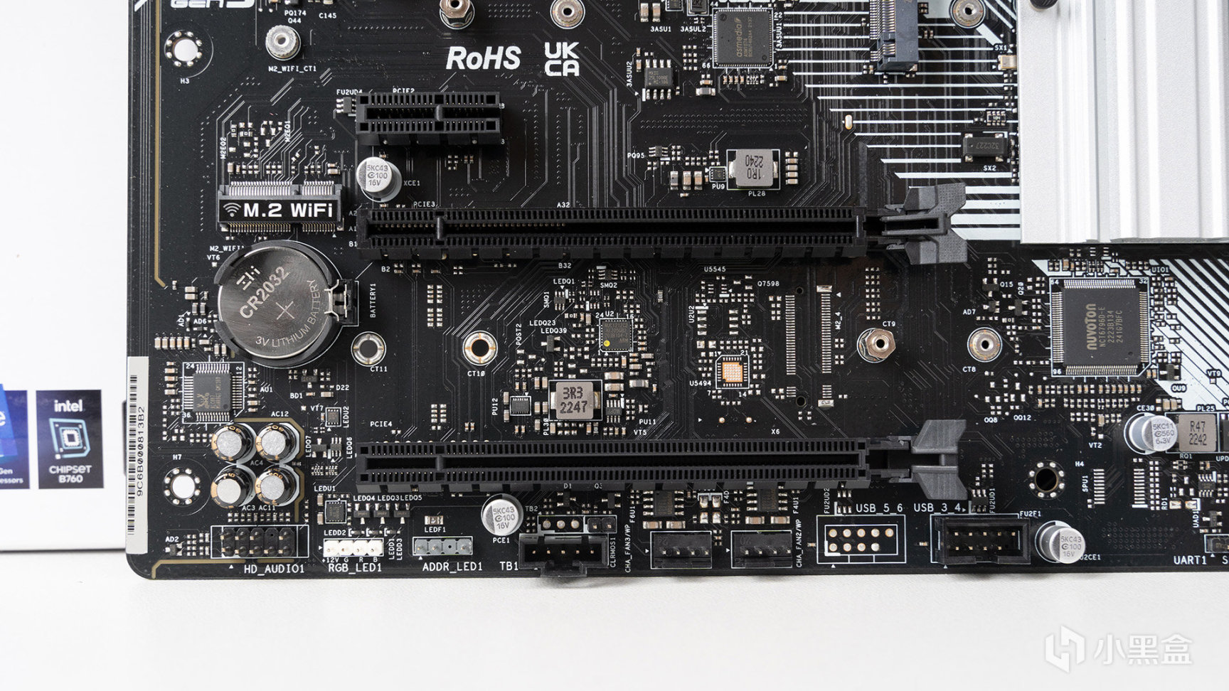 除了常見的PCIe、M.2和I/O接口豐富以外,ATX板型由於PCB更大也能容納更多板載接口,在主板右上角區域,佈局CPU FAN1、CPU FAN2以及兩組CHA FAN,適用於頂置冷排、前置、側置機箱風扇,還有一組12V RGB 4pin和一組5V ARGB 3pin LED燈控插針。
