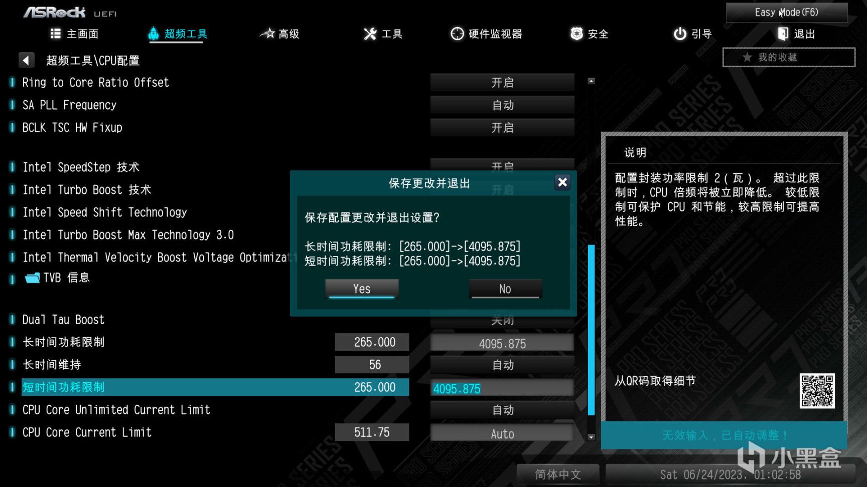 在主板BIOS裏還有一個CPU Cooler Type的選項,也就是對應不同的散熱方案提供不同的功耗牆,最好的一檔是360-420mm水冷,此檔PL1、PL2功耗都是265W,這裏硬核習慣改到4095W最大上限。