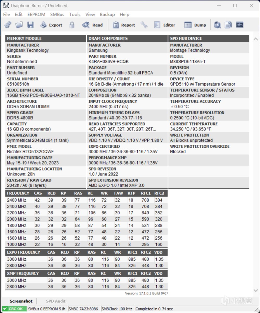 使用Thaiphoon Burner颱風軟件查看下黑刃DDR5 6000顆粒,確認就是三星D5顆粒方案,超頻潛力確實比較小,喜歡折騰一般會推薦白刃DDR5,無論是海力士A-Die或者早期M-Die,都要比三星顆粒好,這方案適合大部分僅開XMP配置的玩家。