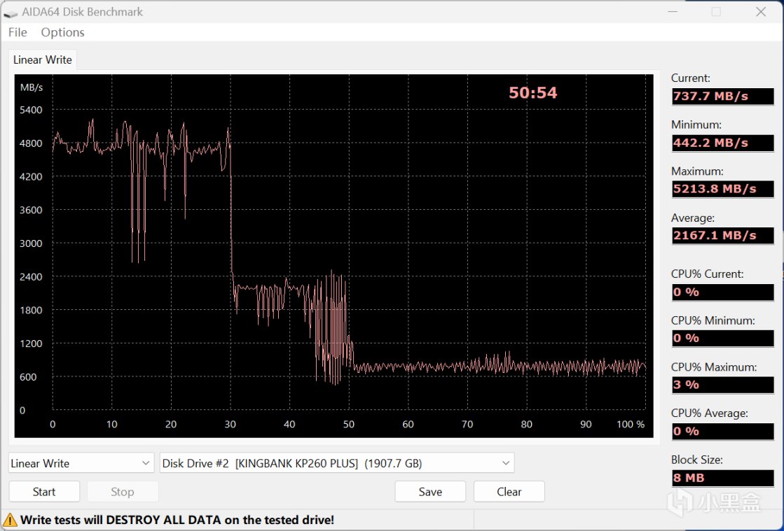 使用AIDA64進行SLC Cache全盤寫入測試,空盤狀態下,KP260 PLUS 2TB在SLC緩存階段中,寫入速度可維持4600 MB/s-5300 MB/s之間,中間有短時的瞬間波動,SLC Cache大小容量充足,大部分日常操作都用不完,中間TLC階段維持在2000 MB/s上下,也有一些波動,最後一段曲線則是擦除回收+寫入階段,寫入速度爲700 MB/s左右,整體表現非常不錯。