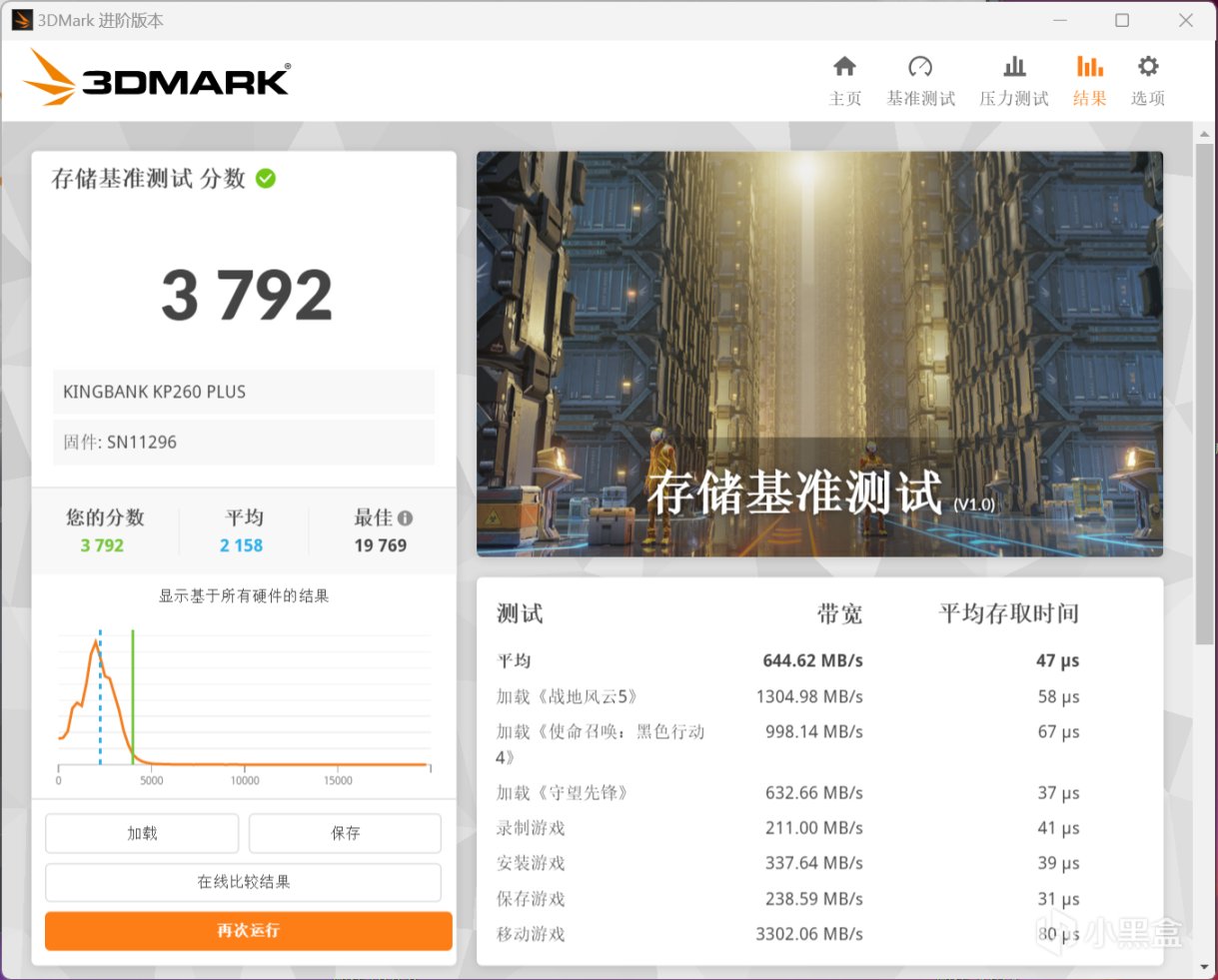 3DMark存儲基準測試,這個項目是用來模擬SSD對於加載、安裝、錄製等多種遊戲場景的表現。可以真實反映SSD在遊戲應用方面的性能,KP260 PLUS 2TB最終得分爲3792,平均傳輸帶寬爲644.62 MB/s,平均存儲時間47us,屬於旗艦級的水平。