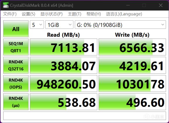 CrystalDiskMark峯值性能Q8T1測試,KP260 PLUS 2TB的順序讀取速度爲7113.81 MB/s,順序寫入速度爲6566.33 MB/s,達到官方標稱甚至略超一些,4K隨機讀寫IOPS讀寫速度分別達到948K IOPS和1030K IOPS,初步來看妥妥屬於旗艦級PCIe 4.0 SSD。