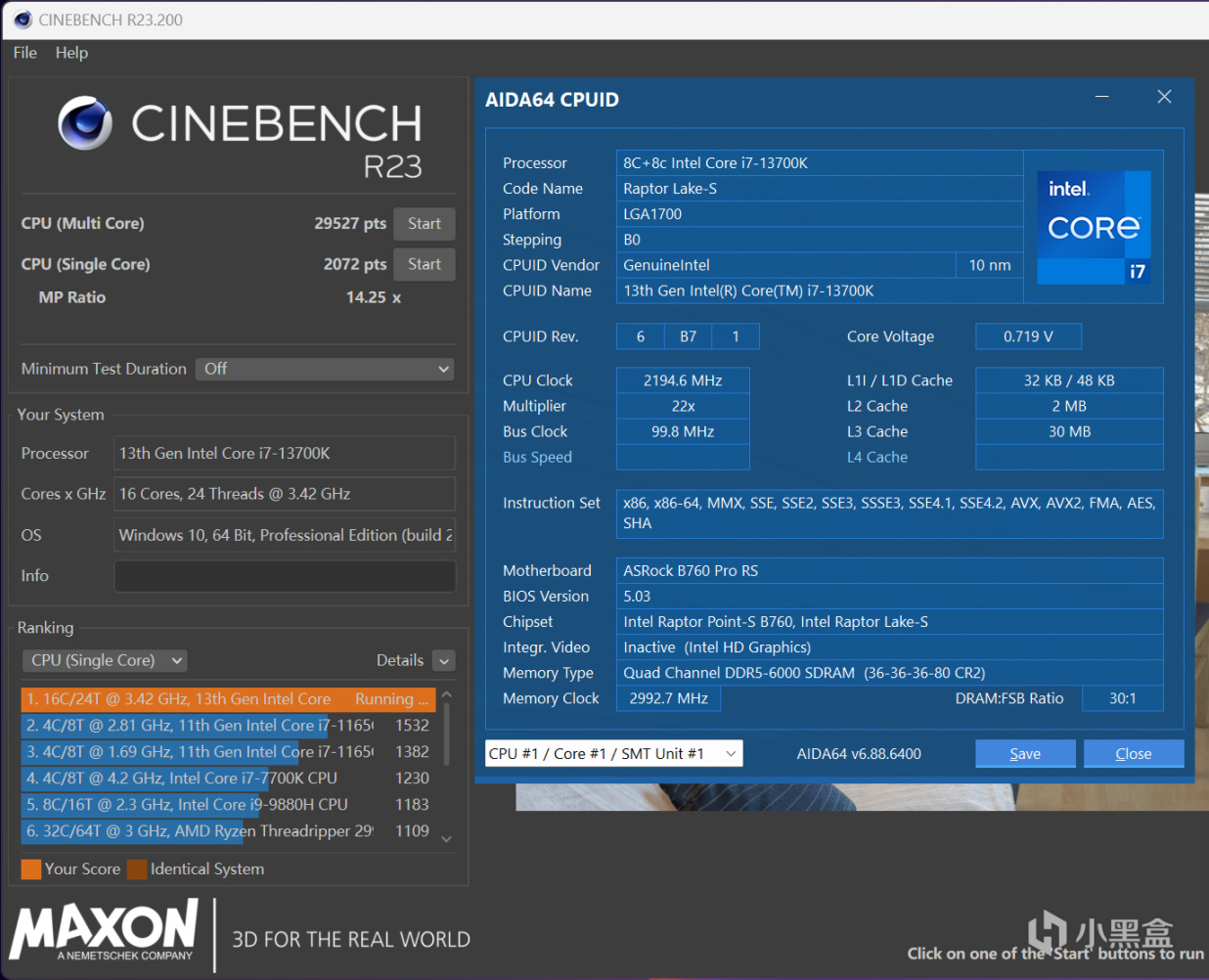搭配B760 PRO RS,CINBENCH R23單輪多核分數爲29527 pts,單核則是2072 pts