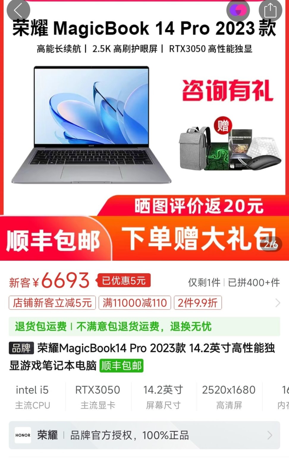 3. 榮耀MagicBook14 pro 2023 -6693元(全能本)
